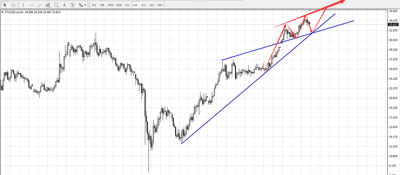 对于原油的做单布局,真是太高估它了。 怎么讲呢,昨日已是原油上行的第四天,对于油价的上行过程需要一个大的回踩(个人需要而已)。而在布局当中也说到,油价的布局大方向如果进行回踩的话,下方必然测试32一线。我们等待接多!但是行情真的是高估它了,一波回踩的上行结构甚至33都没能破位,所以说对于高估的失望,难受至极! 那么话又说回来,此时的原油究竟是追多还是做空?首先对于现在的原油做单,不光市场的投资者犹豫,包括我自己也是一样的犹豫,此时的我也陷入了一种恐慌感,对于原油持有多头的想法以及看法,但是实盘操作方式却想要去做空,所以说就很犹豫!真正的体会到了困惑,也体会到交易者的第二阶段如此之难,看山不是