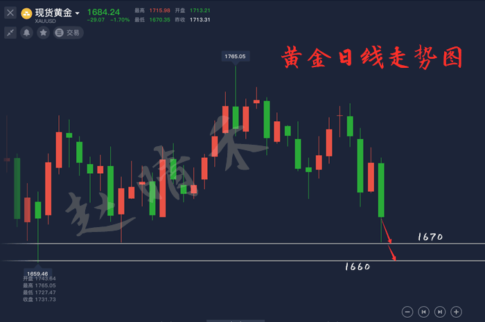 天行健,君子以自強不息,地势坤,君子以厚德载物。提笔安天下,跨马定乾坤。哪有人交易没有喜与悲,都是带着收获与失落,期待与失望的博弈着,有的人自我消化,有的人按捺不住而已初学者为未知的黄金行情彷徨,老练者为已知的寂寞而发愁,独独你我,方向已定,趋势在握,分分秒秒愿都自行支配。 上周五因为非农数据大幅好于预期,强化了市场对于美国经济复苏的预期,同时交易商放弃负利率押注,加上黄金大跌触发了止损导致黄金遭遇进一步的抛售,黄金狂泻50美元触及1670关口,同时金价创下去年9月以来最长周连跌。周一黄金延续反弹之势,目前现报价1689美金。 上图为黄金的一小时图,黄金周五大跌之后依托下方日线