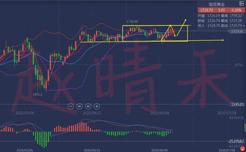 黄金市场最重要的两点:一是要懂得分析黄金市场行情;二是要懂得控制风险,作为一个投资者,在黄金市场中要有着良好的心态及正确的投资心态!有着积极投资心态的人在黄金市场每一次忧患中都看到一个机会,而消极投资心态的人则在黄金市场每个机会都看到某种忧患。不要因为一天的输赢定结果,赚钱是偶然还是必然,是凭真功夫还是凭运气,在黄金投资市场上能活着的肯定是最终能够长期持续赢利的投资者。 黄金回升来到了1745附近,美元指数震荡回落,黄金也受到避险需求的支撑,而美国将不会因为新冠病毒再次关闭经济。这令投资者担忧美国二次疫情的爆发可能更加凶猛,此外全球各国股市涨跌不一,市场风险偏好情绪此起彼伏,
