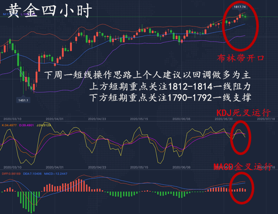 韩凌雨:7.10黄金将多空反转?后市还会涨吗?黄金高位回调修正 周四(7月9日)亚市盘中,现货黄金维持升势,金价现报1815美元/盎司附近。因投资者在新冠病毒肆虐之际寻求避险,各国央行纷纷推出强力刺激措施,以缓解其对经济的影响,金价周三飙升并突破1800美元/盎司,创下2011年9月以来的最高水平。金价周三进一步上涨并一度接近目标价位1825.00美元/盎司。受随机指标负面因素影响,金价自高点有所回落,目前等待随机指标获得足够的正面动能,从而推动金价继续主要看涨趋势,假如突破1825.00美元/盎司,金价下一目标看向1855.00美元/盎司。 市场两大风险事件 如今,市场上还有另外两个风险事