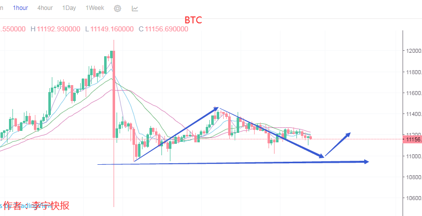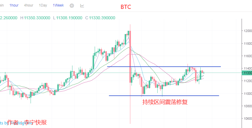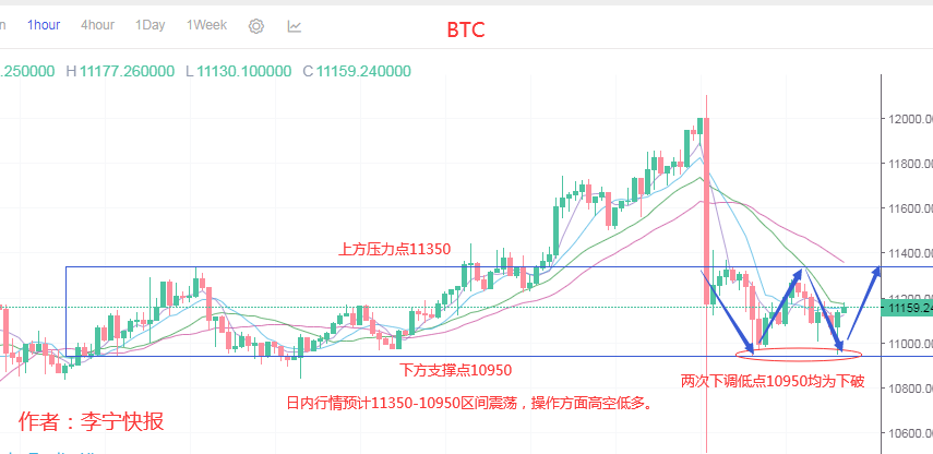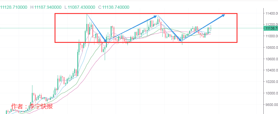 静心观流水,冷眼看世态,投资不是一潭死水,偶尔会有一些风吹草动,如风景一路的歌。行情亦是如此,它不断地将礼物送到你的手中,而接不接受就在你自己。当然,机会也不是靠等来的,总是等待机会,就会失去机会。李宁坚持,心态决定了苦与乐,观念决定了成与败,做人越简单,交易就越宁静。 【BTC行情解析】 日线图中,行情11400下方波动,从走势看多头趋势较重,上探高位只是时间的问题;下方的支撑点在10800美元,向下的趋势经过多日的试探,还是一无所获;故李宁从当前的指标来看,近期的行情将在11400-10800区间震荡,如突破任意点位即可顺势而为。 小时图中,行情在逐渐从布林带的中轨下方走出,现已走上上轨