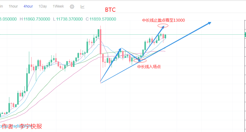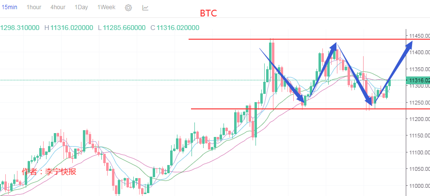 静心观流水,冷眼看世态,投资不是一潭死水,偶尔会有一些风吹草动,如风景一路的歌。行情亦是如此,它不断地将礼物送到你的手中,而接不接受就在你自己。当然,机会也不是靠等来的,总是等待机会,就会失去机会。李宁坚持,心态决定了苦与乐,观念决定了成与败,做人越简单,交易就越宁静。 【BTC行情分析】 比特币在昨日回调至11000位置附近反弹之后,行情虽然有点磕磕绊绊,但整体上涨趋势明显,在突破11250压制位置后,更是进一步走出一波上行。日内延续行情延续上行,打破前期压制11386位置,目前高点止步于11448位置。走势小幅回调于11336位置附近运行,日内还有上涨的可能。 四小时图上看,布林带呈向上