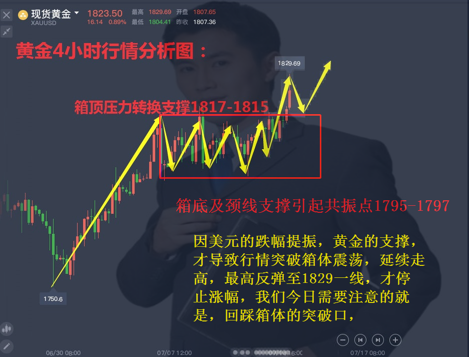 陈鹏论金文章摘要 :2021年7月18号新手炒黄金需要知道哪些常识?7.18投资现货黄金原油能赚钱吗?7.18黄金大趋势还能看空吗?7.18伦敦金空单被套怎么解?7.18美元的涨跌对黄金有什么影响?7.18做黄金怎么才能避免爆仓?7.18黄金今日还会涨吗?7.18黄金中长线怎么做单? 近期都有哪些消息面会影响黄金走势? 对于周五而言黄金开盘与1829附近,随后行情冲高至1831.8一线,受压回落至1829一线,开始震荡偏弱下跌,这种跌势延续到下午时段,行情一直沉陷1820平台支撑位,上下徘徊,那么在16:40分时,行情跌破1820关口支撑,顺势快速下跌至1815前期箱体支撑位