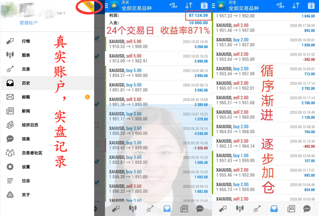 永远不要低估市场的力量,保持敬畏与机敏!———大家好我是柏梦月老师! 当你在到处寻找文章看建议的时候,证明一点,你在亏损!要么就是对自己操作手法不自信或者结果不理想,我们把资金拿来做投资是为了获得收益,不是拿来亏损的,行情来临时仅凭一个没有专业知识、大量操作经验的你,你觉得自己能把握多少收益呢? 从业多年这个市场确实变了,被人(所谓的业务员)搞的不如从前,很多人怕,怕下单,怕金融老师,怕行情,总之什么都怕。但你在一个正确的指导之下,实现稳健获利并非难事。本人用事实说话:下图为我实盘学员交易实况,入金1万美金,通过指导循序渐进,逐步增加仓位,用时24个交易日实现本金增涨8.7倍,准确率达81%