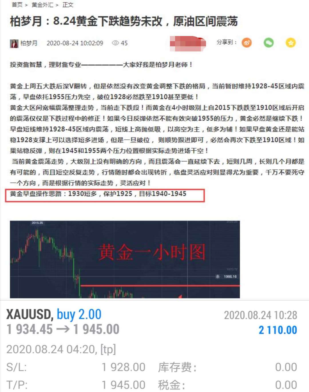投资靠智慧,理财靠专业——————大家好我是柏梦月老师! 交流指导QQ:3255616943 交流指导微信:bmy195 【关注柏老师者可体验3天体验单,让你告别“盈利为过程,亏损为结果”】 @实盘学员 黄金亚盘时段行情处于1944一线,盘中给出现价做空思路,1930止盈出局,短线操作及时把握利润,落袋为安。今日喊单精准正确。 如果你一定要问我一周具体能带你赚多少,我会选择用事实说话:6月9号跟上柏老师的魏先生在投资市场辗转数载,无数的资金都交了学费也未找到盈利的窍门,但是最终找到柏老师并且跟上操作,入金1.4万美金,一共操作7单盈利1.7万美金,随后出金1.5万美金及时到账,留下1.6万美