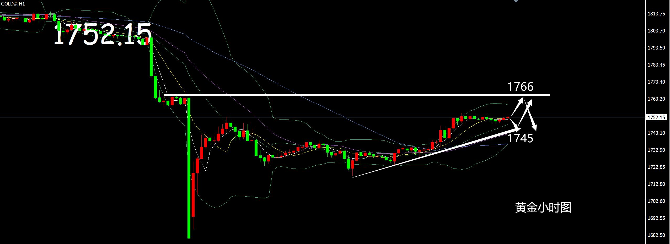 黄金,周一超跌反弹之后,在周二日线报收十字星,昨天周三突破十字星高点1738走了连续反弹形态,价格收盘在反弹的高点1752附近,大涨大跌之后需要一个震荡的过程,随后才是方向上的抉择。 四小时周期还是属于收口阶段,今天应该还是高位区间震荡,不过多头占据盘面优势,行情至少在日内难跌,1752这个位置应该守不住,如果承压凌晨应该就会出现回落的力度,但凌晨是高位横盘,今日早间也没有回撤,继续保持强势横盘。 小时线周期上已经走出震荡上升形态,价格围绕趋势线稳步上行,日内支撑在1744-45一线,回踩触及做多,止损1738,目标看1756,上方开跌口在1766,触及做空,止损1772,目标看1754一线