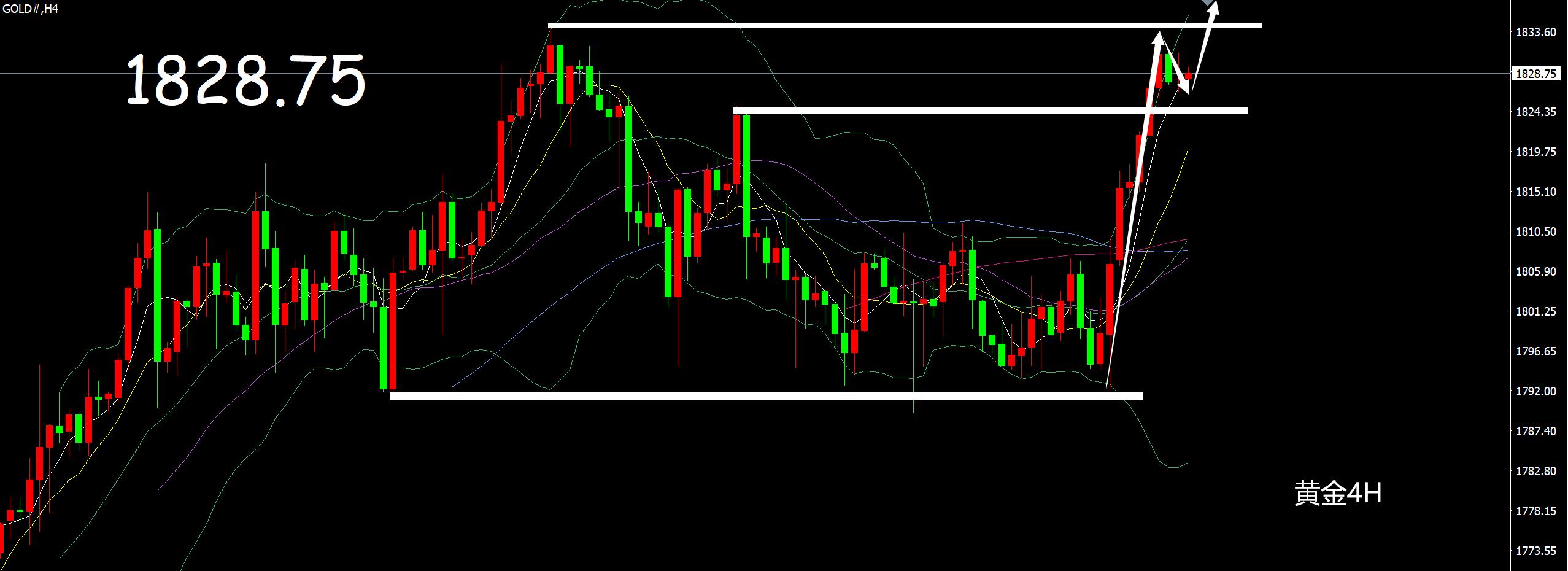 黄金,日线连续震荡后向上发力拉升,符合前期对行情的预判,前面说过两种运行方式,第一价格无法跌破1790向上企稳拉升;第二价格刺破1790探底回升,当前属于第一种,反复支撑在1790上方形成物极必反形态。 昨天周四大阳,不过没有直接破位1834压制位置,所以今天很关键,如果强势势必会破位,下个阻力就是1852,同时要是日内连续回撤疲软走势,今天周五就是震荡修正,注意关注日内走势情况。 四小时周期上还是强势多头,日内建议先多即可,上方继续看破位,建议1827-28直接开多,止损1822,目标看1840、1850,如果日内连续回撤,美盘再考虑做空,当探底回升看待。 原油,四小时高位震荡后向上拉升破
