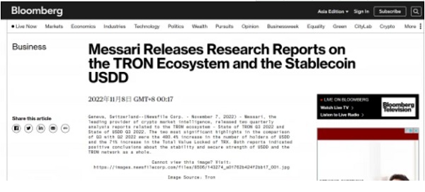 近日,权威加密研究机构Messari发布了波场TRON以及TRON链上稳定币USDD的研究报告,引发行业广泛关注。这是Messari研报首次覆盖USDD和波场TRON,这两份报告均对USDD和波场TRON网络整体的稳定性和安全性给予了正面评价。在当前由于FTX流动性危机导致的动荡的行业背景下,来自Messari的肯定无疑给行业和波场生态用户及合作方带来了“定心丸”。这两份报告也成功出圈,报告相关内容被传统权威财经媒体和区块链行业权威媒体争相报道,其中不乏彭博社、市场观察(Market Watch,道琼斯集团旗下新闻网站)、AOL、雅虎财经、Bitcoin.com等多家国际知名媒体。 Mess