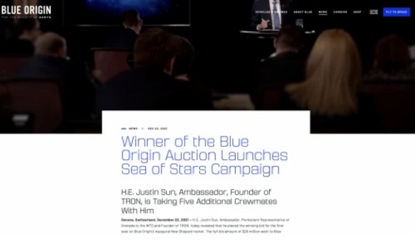 2021年12月22日,TRON DAO创始人孙宇晨通过推特表示,已成功拍下蓝色起源“新谢泼德号”火箭飞船首次发射席位,并与蓝色起源公司达成协议,将其转化为一整艘飞船的权益,发起“星辰大海”活动,在新的太空征程中额外带五名船员一同探索。 据悉,孙宇晨将通过“星辰大海”活动“全包”5名船员的船票,用于支付此次馈赠之旅的2800万美元竞标资金也早已全部捐给蓝色起源慈善基金会“Club for the Future”,用于19个基于太空探索的非营利性慈善机构,以激励后代从事STEM职业,助力未来的太空生活。 对于发起“星辰大海”活动的初衷,孙宇晨曾在采访中表示,“发起‘星辰大海’活动,目的在于激励
