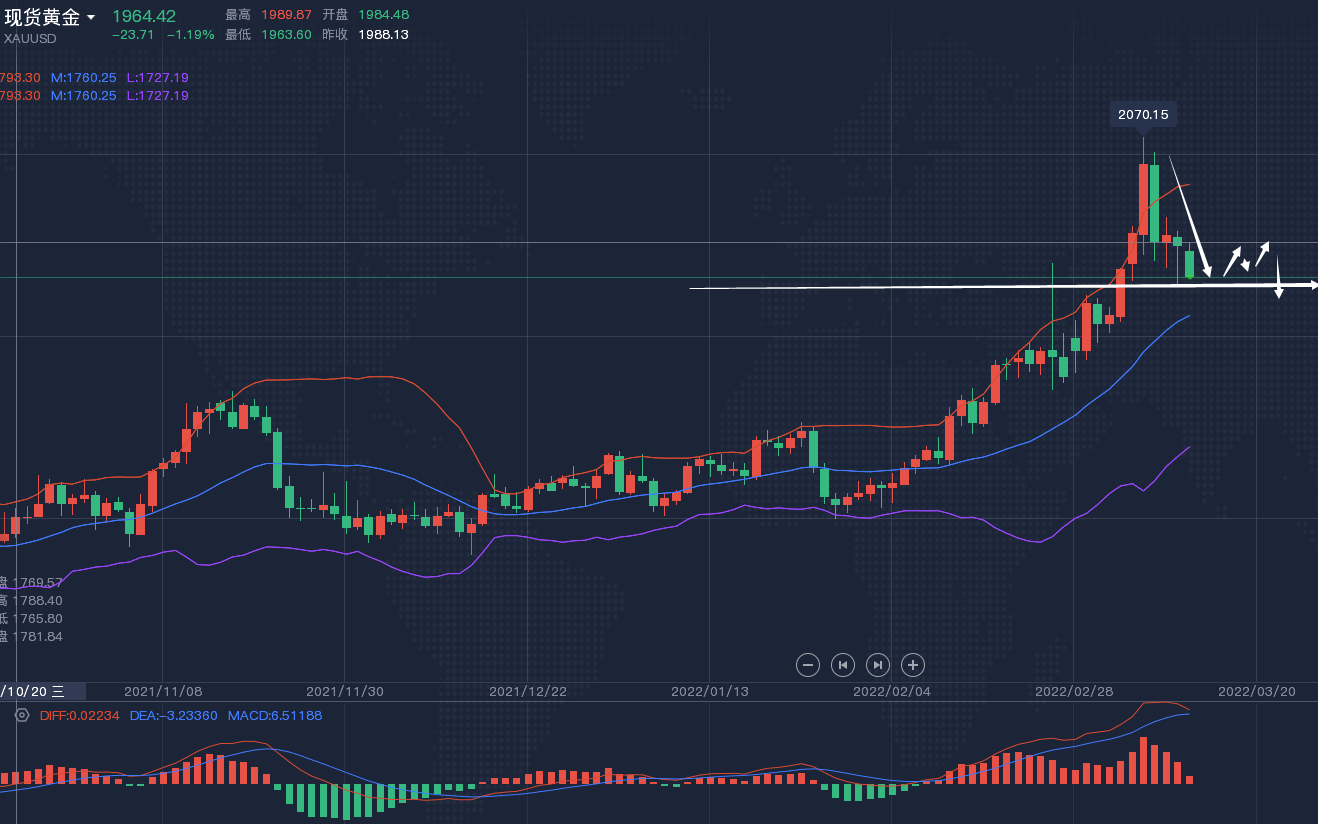 大家好,依旧是奋斗在一线的云宸给大家带来最新金油策略! 3月20日 星期日 赠言:市场风云再起,你我定乾坤,切莫踏上不归路。 ---3.20黄金明日分析如下: ①、黄金多空转换一瞬间,目前战事避险情绪消退,新一轮的“美元战”再起,俄方为了反制米国宣布将去美元化,因为俄是能源大国这就会让与其有贸易往来的国家减少美元的使用,从而打击美元霸主的地位,同时也算是利多黄金。但是米国随即表示将持续加息缩债来提振美元,这也会使全球美元回流,只要后市能抑制通膨那么黄金可能继续承压,所以大趋势上笔者个人倾向于空头。 ②、再看盘面中:日线图中已经是完美头肩顶的下行形态,上周触低点1895反弹这不是反转,只能看做