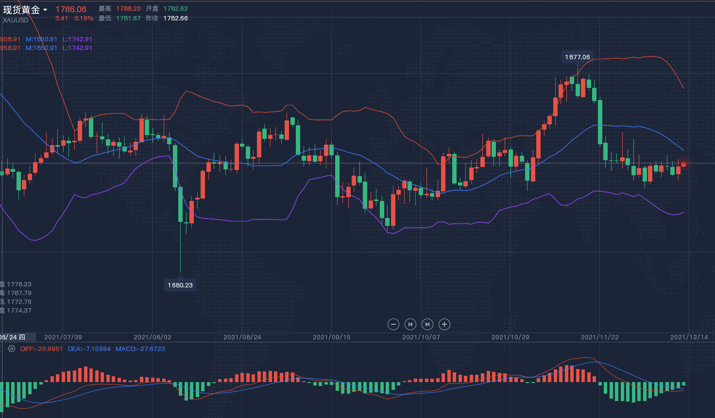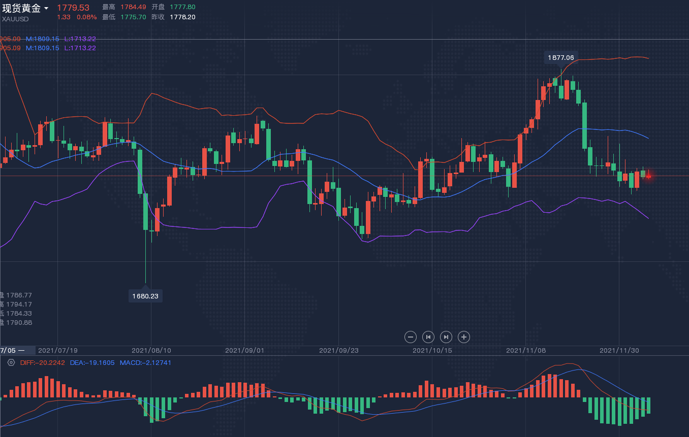 大家晚上好,依旧是奋斗在一线的云宸给大家带来最新金油策略! 12月21日 星期二 赠言:人生有几件绝对不能失去的东西:自制的力量,冷静的头脑,希望和信心! ---12.21黄金原油晚间分析如下: ①、黄金晚间就不过多阐述了,即昨日咱们强调过了美联储鹰派言论的影响导致金价上行动能不足后走跌,大家要注意一点不要直接追空,因为这还不是趋势性的跌势,只能算是技术面的回调,因为下方1788支撑位守住,依旧延续着周线与日线震荡的状态,这里也是布林中轨前一根阳烛实体二分之一的位置,所以此位的守住让黄金陷入震荡,一切的重点将放在周四的PCE数据,那么晚间布局上按照区间的格局来进场,下方1790-1788开多