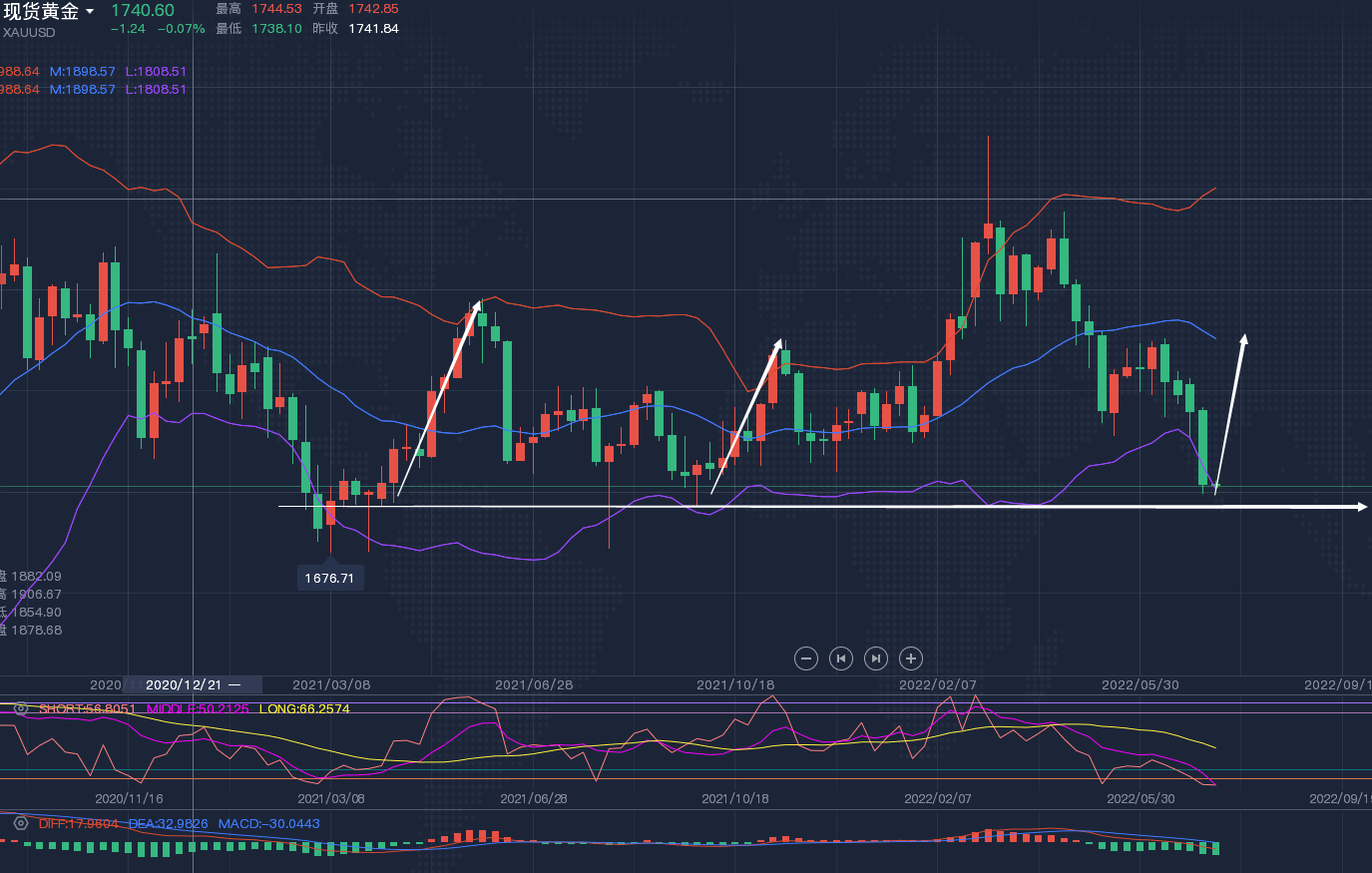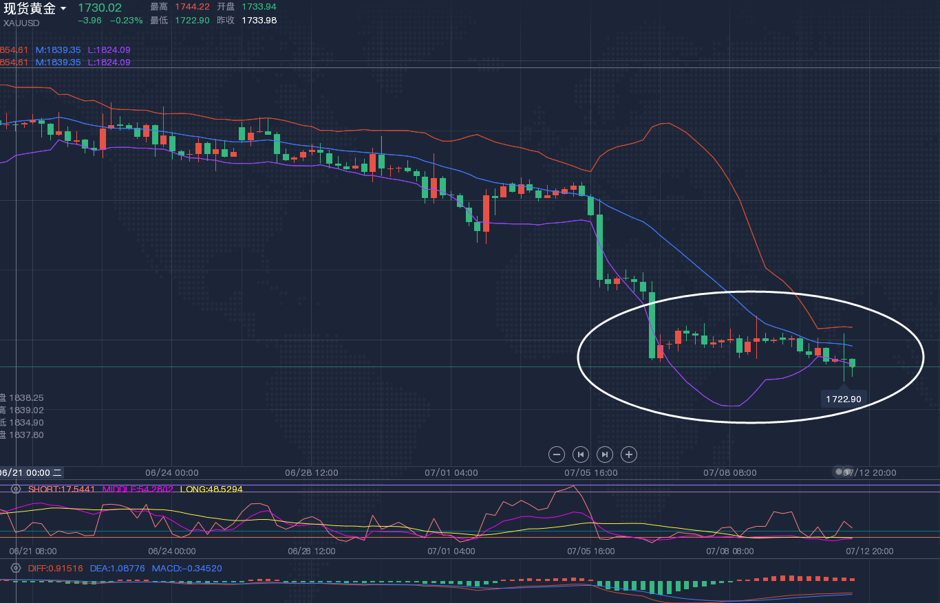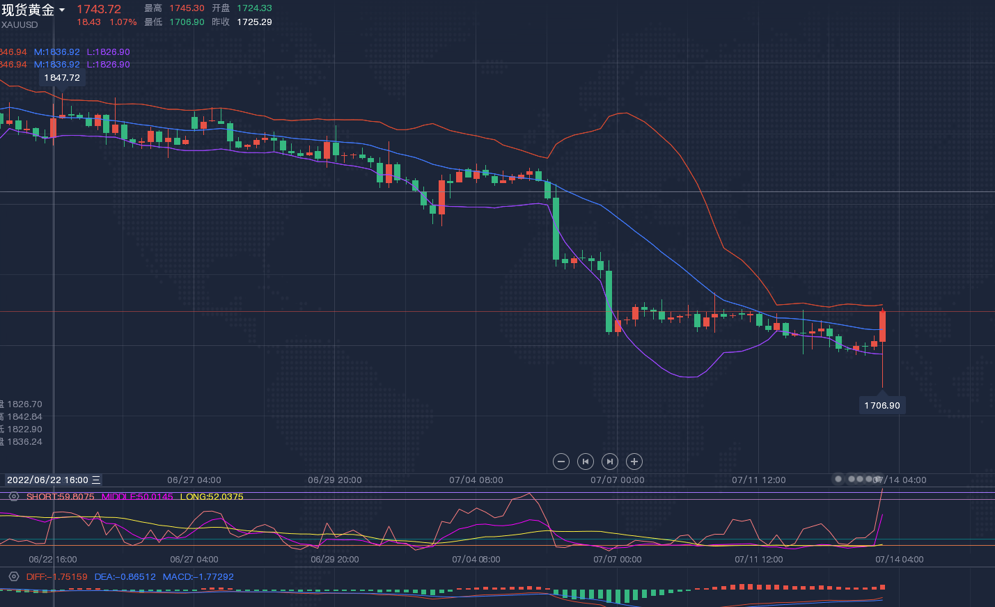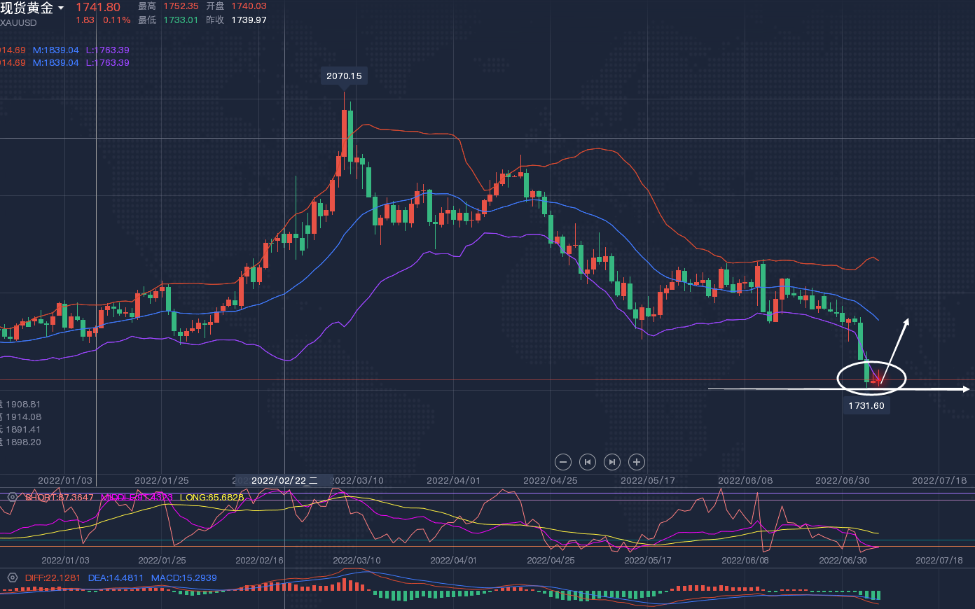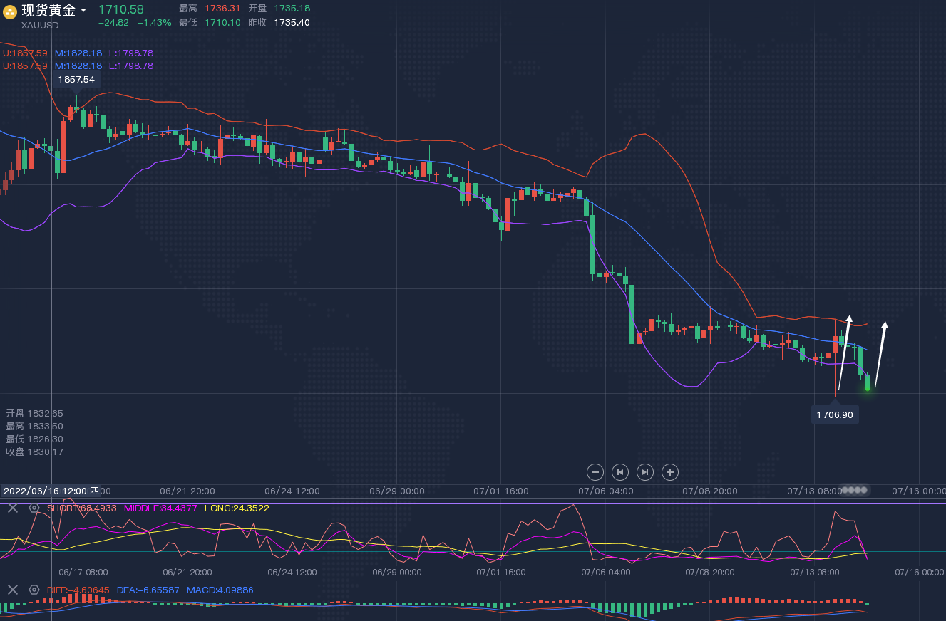 大家好,依旧是奋斗在一线的云宸给大家带来最新金油策略! 7月14日 星期四 赠言:每日简简单单几句肺腑之言,希望能帮到正处于迷茫中的你。 ---7.14黄金原油日内分析如下: ①、黄金方面虽然高通膨会加快美联储加息利空金价的步伐,但是市场已经疲倦不在买账,从而出现买预期卖事实的V型反转走势,反弹有望反攻。但是一定要抓住机会进场,因为市场预测美联储或将7月加息100个基点,短期来说会使美元走高来打压金价上行,而从趋势上而言技术面有反弹需求,起码再次试探1752-1762一带修复后在选择空不迟,总结就是一句话:通膨是否见顶还不确定,乱世之下黄金多头有卷土重来的契机,故而点位上大家激进可现价171