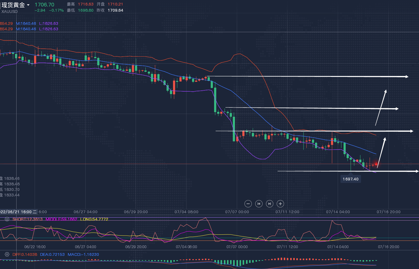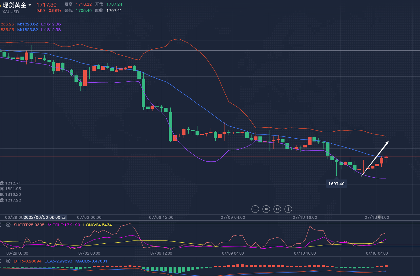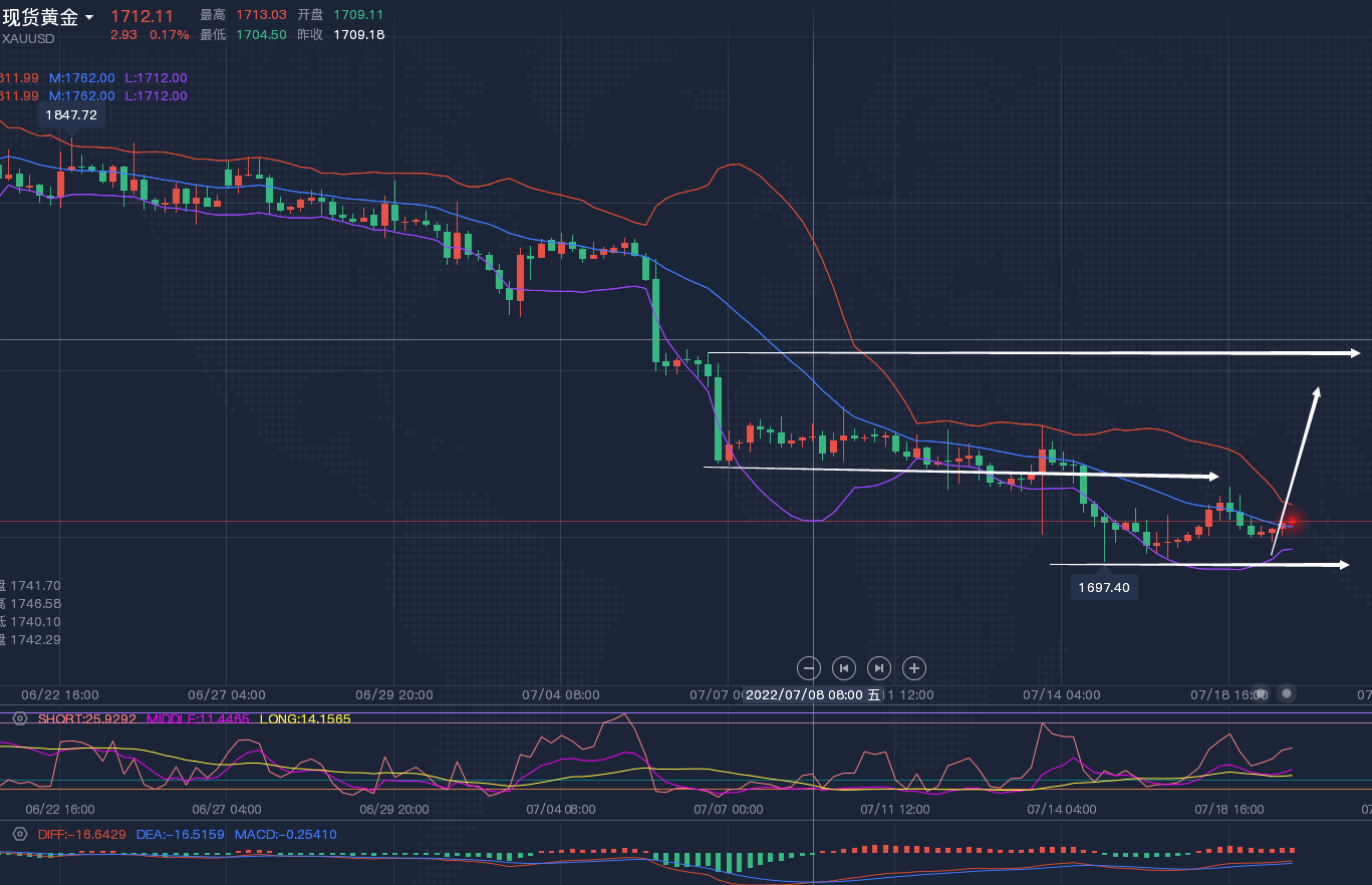 大家好,依旧是奋斗在一线的云宸给大家带来最新金油策略! 7月19日 星期二 赠言:每日简简单单几句肺腑之言,希望能帮到正处于迷茫中的你。 ---7.19黄金原油日内分析如下: ①、黄金方面其实周初不需要太多废话,抓住重点分析收获不会少,首先美指探顶后日线连阴下行,让黄金的避险属性再度开启走高,属于其一利好金价,其二本周开盘后缓步上行,下跌浪型基本走完筑底的格局良好,并始终企稳1700关口之上,这对于多头趋势反转奠定了基础,其三美联储部分官员对7月加息100个基点的行为有反对意见,这本是空头唯一的助力目前也岌岌可危,加上盘面4小时图中有金叉向上迹象,四大利好黄金助阵,上涨也是板上钉钉了,所以周