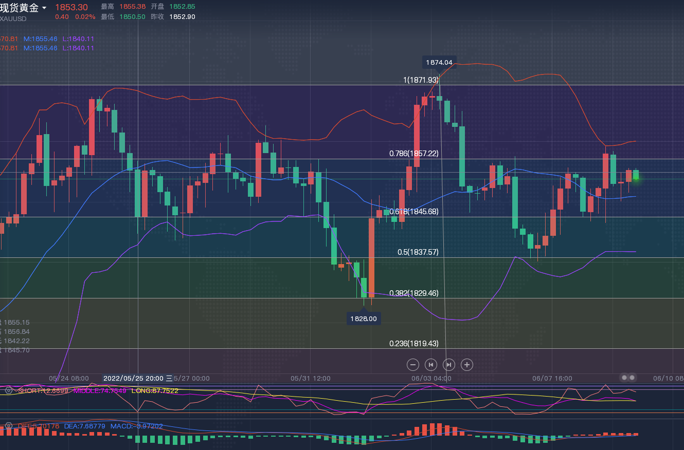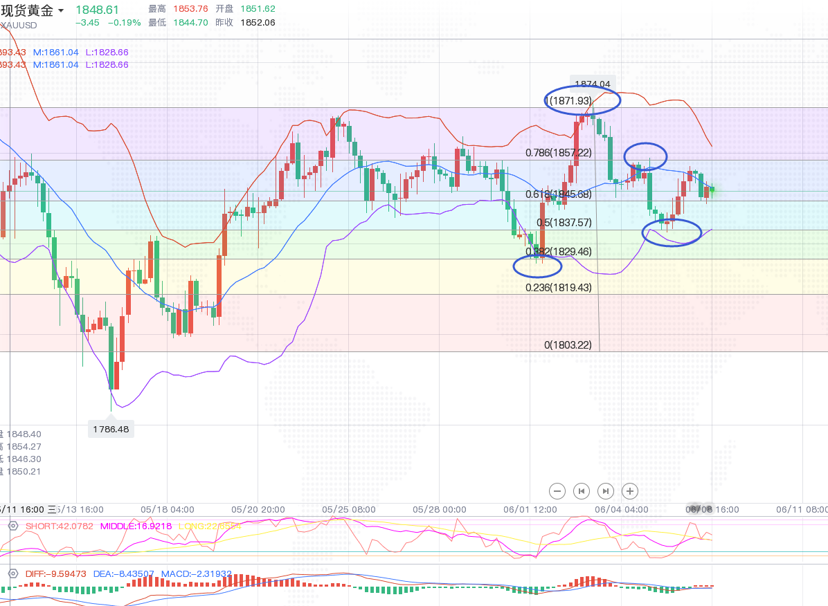 大家好,依旧是奋斗在一线的云宸给大家带来最新金油策略! 6月8日 星期三 赠言:每日简简单单几句肺腑之言,希望能帮到正处于迷茫中的你。 ---6.8黄金原油日内分析如下: ①、黄金因美联储噤声期行情波动小,比较无趣,恐怕需要周五的CPI数据来带动了。我们先看趋势结构上:多空延续性较差,但拐点很明显,上有1855-1857压制,下有1835-33支撑,这种多空相争之下谁先破位必将出现新趋势,就笔者个人而言,更加倾向于空头下跌,理由有三:一,美指涨势如虹持续打压金价,二黄金小周期顶部1872构建完好,持续加息之下难冲高点,三浪性结构上有望形成C浪下行格局,所以今日布局很简单,继续高空才是主利润方