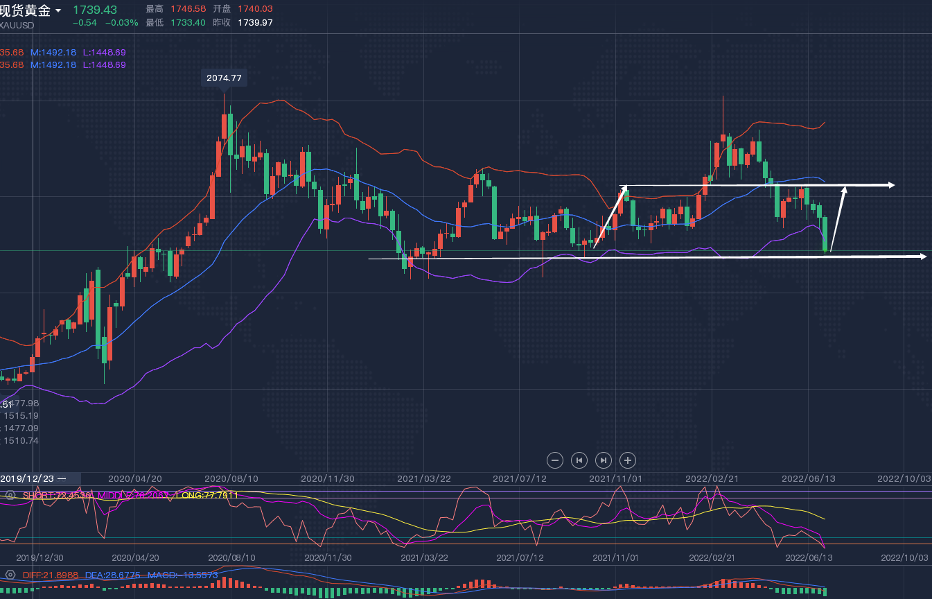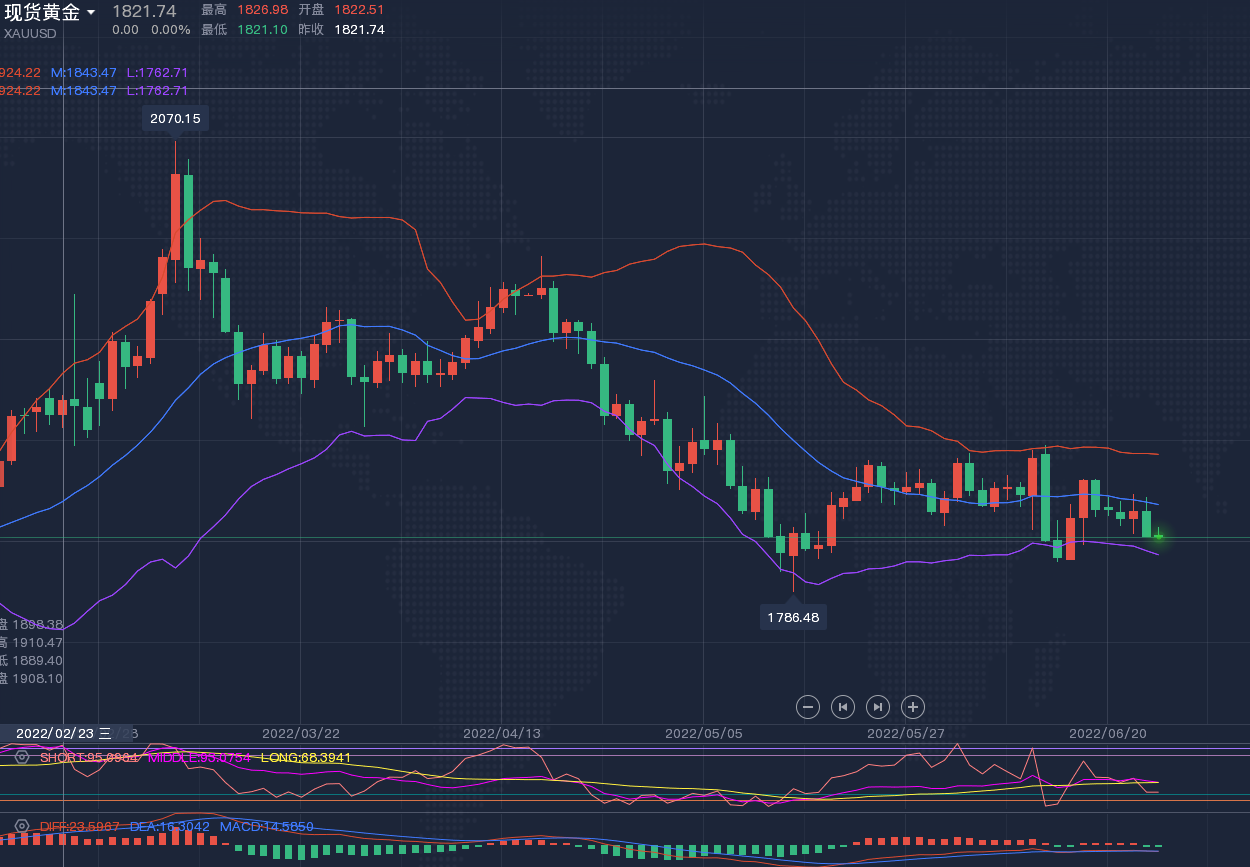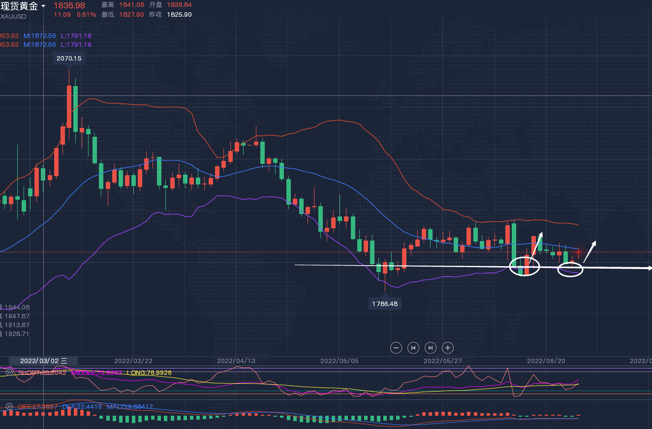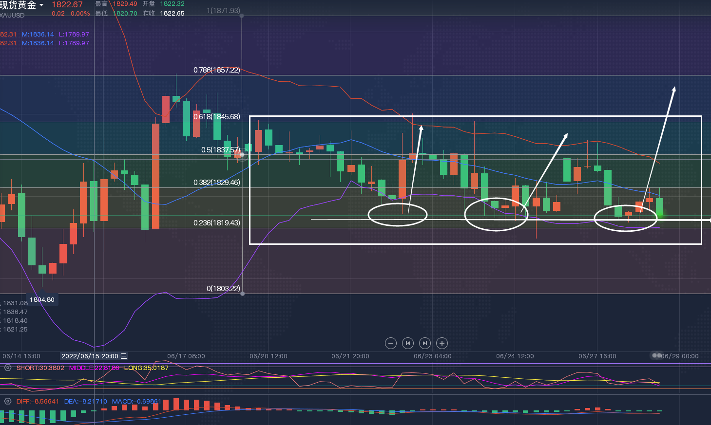 大家好,依旧是奋斗在一线的云宸给大家带来最新金油策略! 6月28日 星期二 赠言:每日简简单单几句肺腑之言,希望能帮到正处于迷茫中的你。 ---6.27黄金原油日内分析如下: ①、黄金看似反弹微弱量能不足,实则或是暗藏玄机准备起底走高,因为目前始终未能解决高通膨的问题,加上当下地缘风险再度紧张市场避险情绪浓郁,黄金短期内想走大跌较为困难,即便是激烈的加息言论也只是让金价用时间换空间的走法去消耗掉空头,当市场都在看空之时,需防止黄金反将一军报复性反弹走高。 ②、再看盘面走势:咱们提到的1820支撑关口始终是牢牢守住,虽然高点仿佛在逐步降低(1858-1848-1840),但是中期多头结构依然完