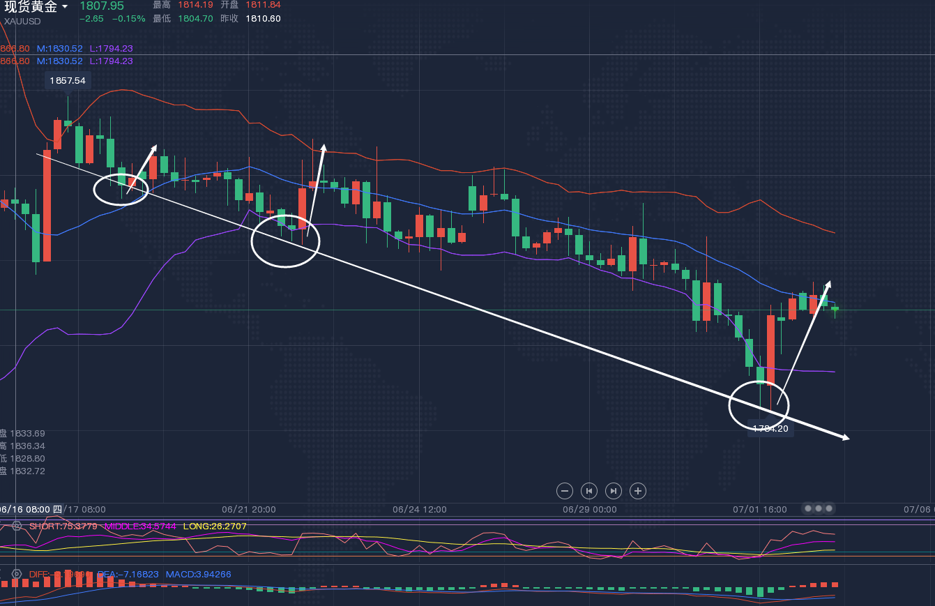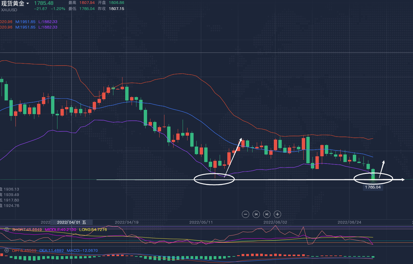 大家好,依旧是奋斗在一线的云宸给大家带来最新金油策略! 7月4日 星期一 赠言:每日简简单单几句肺腑之言,希望能帮到正处于迷茫中的你。 ---7.4黄金日内分析如下: ①、黄金方面今日因美独立日将提前休市,行情惨淡是必然,参与性不强。所以咱们预测后市的走向从两方面来解读:第一,从上周公布的通膨PCE以及初请数据来看无论是消费水平还是制造业都在走下坡路,显示米国经济不稳从而引发高通膨的担忧,虽有美联储的接连加息但是市场担忧未减,这也是为何金价再度反弹的原因,后市延续走高的概率较大。 ②、第二,再看盘面走势很明显下行后触及前低1785后快速反弹,此位是日线以及周线强的支撑地带,从浪型中可看做是日