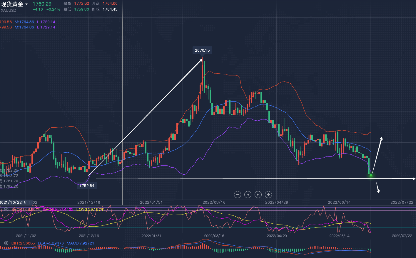 大家晚上好,依旧是奋斗在一线的云宸给大家带来最新金油策略! 7月6日 星期三 赠言:每日简简单单几句肺腑之言,希望能帮到正处于迷茫中的你。 ---7.6黄金原油美盘分析如下: ①、黄金大跌是真正的趋势已经到来吗?此时还要打一个问号,因为昨日的大跌是机构主力的推进导致,同时市场担忧依旧在,不排除机构是在非农公布前的最后一波诱空行为,还有最重要的则是盘面1752年线支撑分水岭情况,此位只要不破后市多头将卷土重来,笔者对大趋势而言依旧看好多头反攻,而短线上很明显的4小时线中进入超卖区域,有反弹迹象,加上浪型的5浪下跌算是走完,即便美元在强势来打压金价,技术性的反弹修复一定会存在,故而晚间做单上可先