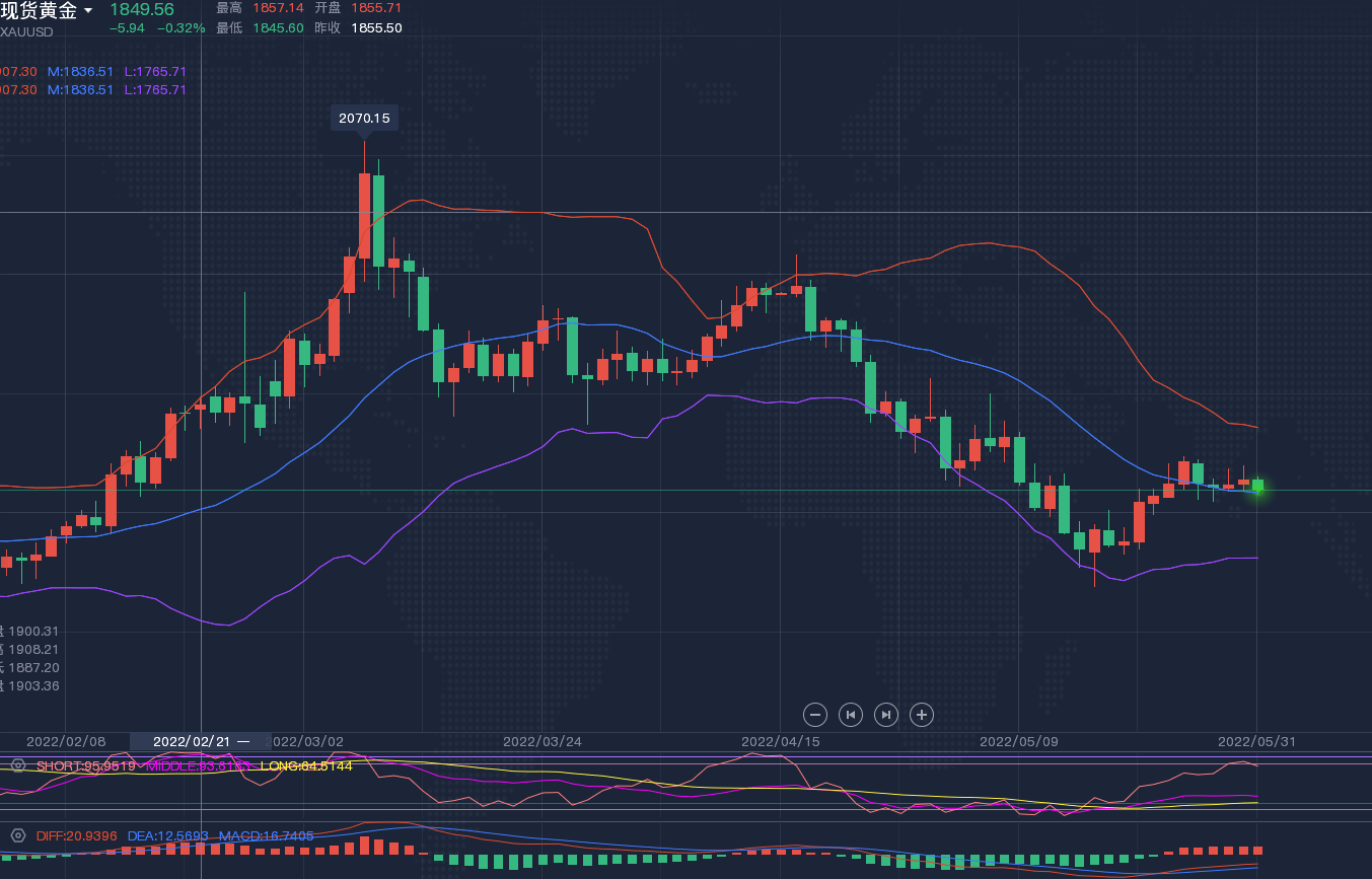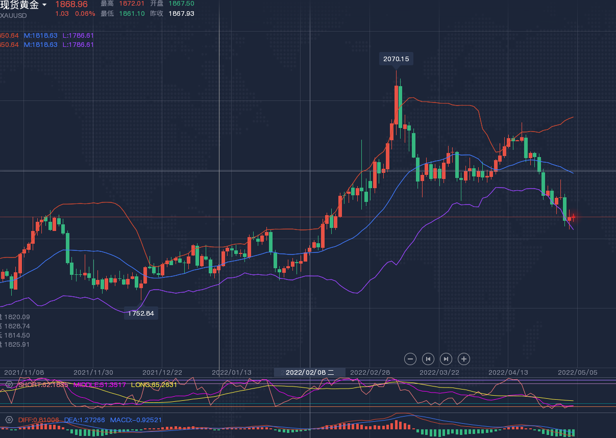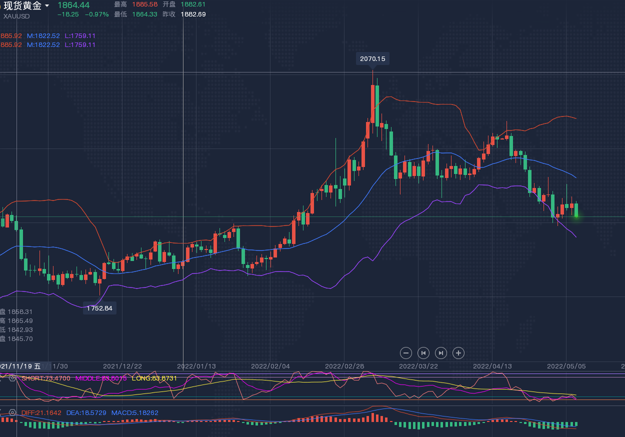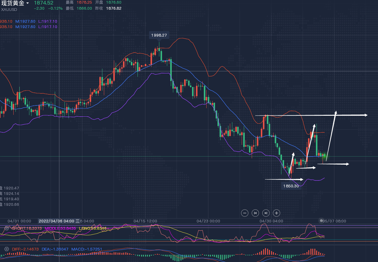 大家好,依旧是奋斗在一线的云宸给大家带来最新金油策略! 5月5日 星期四 赠言:成功不是将来才有的,而是从决定去做的那一刻起,持续累积而成。 ---5.5黄金日内分析如下: ①、黄金先谈加息结果:美联储宣布加息50个基点以及逐步缩债,属于利空信息,但黄金却是触底反弹大幅上涨来到咱们预期1900高点,原因有二:第一加息结果与市场预期一致,并没有惊喜,市场前期的炒作空头已经完成下跌。第二:盘面中日线收探底十字阳线,表明下方支撑强劲,有继续走高的动能,所以加息结果没有惊喜,各投资者在目前局势不稳的情况下再度让黄金多头起飞也是情理之中。 ②、再看结构上:日线结构中黄金在连续性下跌过后确认1850低点