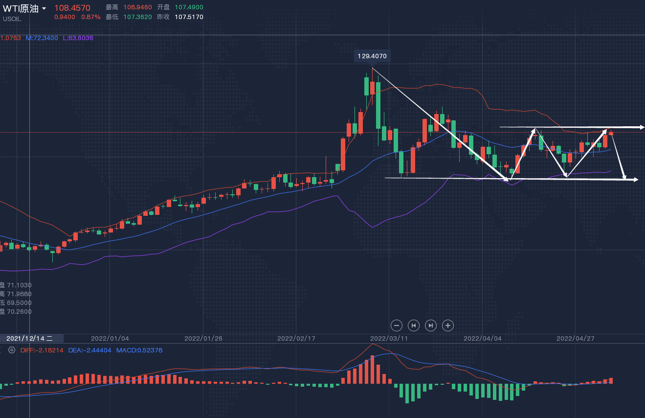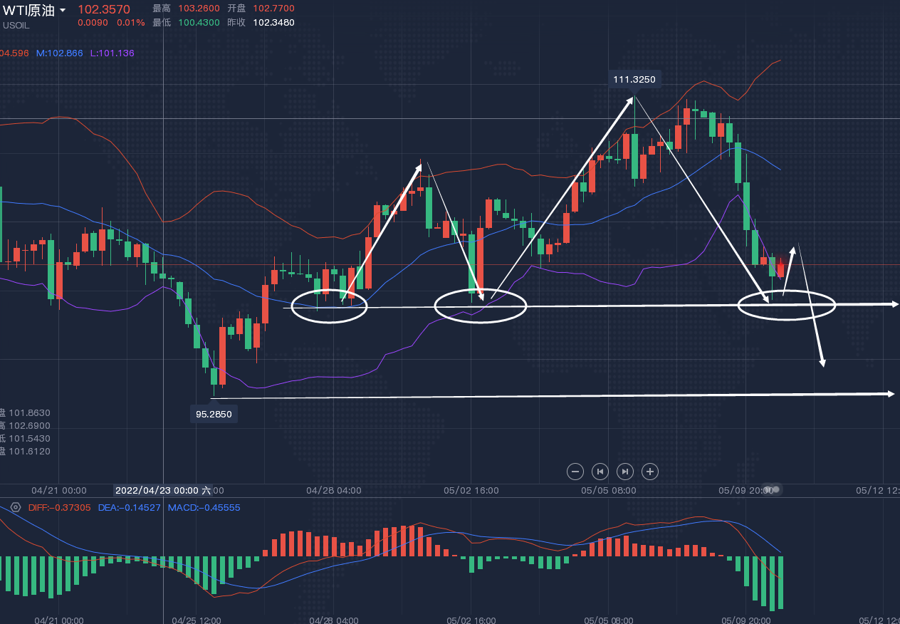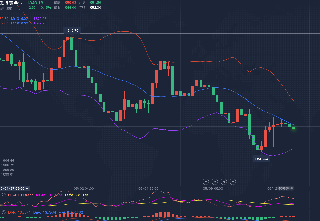 大家好,依旧是奋斗在一线的云宸给大家带来最新金油策略! 5月12日 星期四 赠言:成功不是将来才有的,而是从决定去做的那一刻起,持续累积而成。 ---5.12黄金原油晚间分析如下: ①、黄金自从触及趋势通道1830支撑反弹后,日内整天都在1850顶底转换位震荡,就笔者个人来看目前的反弹只能当做是下跌后的一波修正,而不能当做强势来对待,因为当下美指涨势如虹,暂无回撤的意愿,而且白银已经率先大幅走跌,对比这两参照物,都将给到黄金上行压力,同时盘面20日周期移动平均线限制了金价的上行动力,动能指标在负区域内上升,且RSI还未出现严重超卖迹象,表明市场对买入黄金的兴趣不大,所以综合而言主思路先暂定高