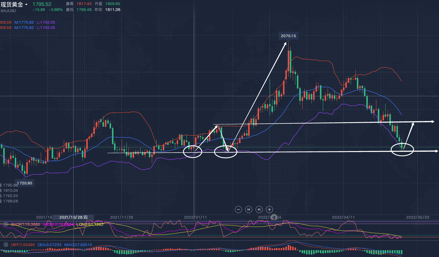 大家好,依旧是奋斗在一线的云宸给大家带来最新金油策略! 5月16日 星期一 赠言:在挫折中坚强,在逆境中前行,在失败中奋起,一定会赢得成功的掌声。 ---5.16黄金原油日内分析如下: ①、黄金受限高通膨担忧美联储加快加息的步伐,欧盘一度连破支撑来到低点1786一带后反弹,从整体上看黄金偏弱是无疑的,但是现在追空吗?笔者告诉大家完全没必要,首先咱们从盘中可以看到日线双底反转支撑都在1780一带,十分强劲,说是起涨点也不为过,不出意料这波快速下探就是加速赶底后准备走高。其二:尽管加息让美元升值有利于通胀减弱,但同时也会推高除美之外的进口价格,或许会进一步推高通膨,导致避险情绪拉升金价报复性反弹