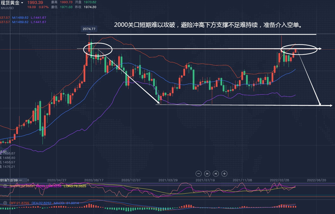 大家好,依旧是奋斗在一线的云宸给大家带来最新金油策略! 4月19日 星期二 赠言:成功不是将来才有的,而是从决定去做的那一刻起,持续累积而成。 ---4.19黄金日内分析如下: ①、兵败如山倒,黄金避险难破2000大关开启回落,也是意料之中,因为从盘面可以看到好似每日都在缓步走高,但从未延续而是大涨后都会历经20美金的跌幅,从这一点就可断定并不是趋势强,而是当前地缘引起的短暂反弹,而且最大利空就是5月临近的加息缩表,只要它在就一定会打压金价,所以大趋势波段空依然是主旋律。 ②、再谈盘面:目前金价是承压分割线0.786之下的(也就是2000关口),这是真正的右肩压制,若是本轮能顺利跌破1950