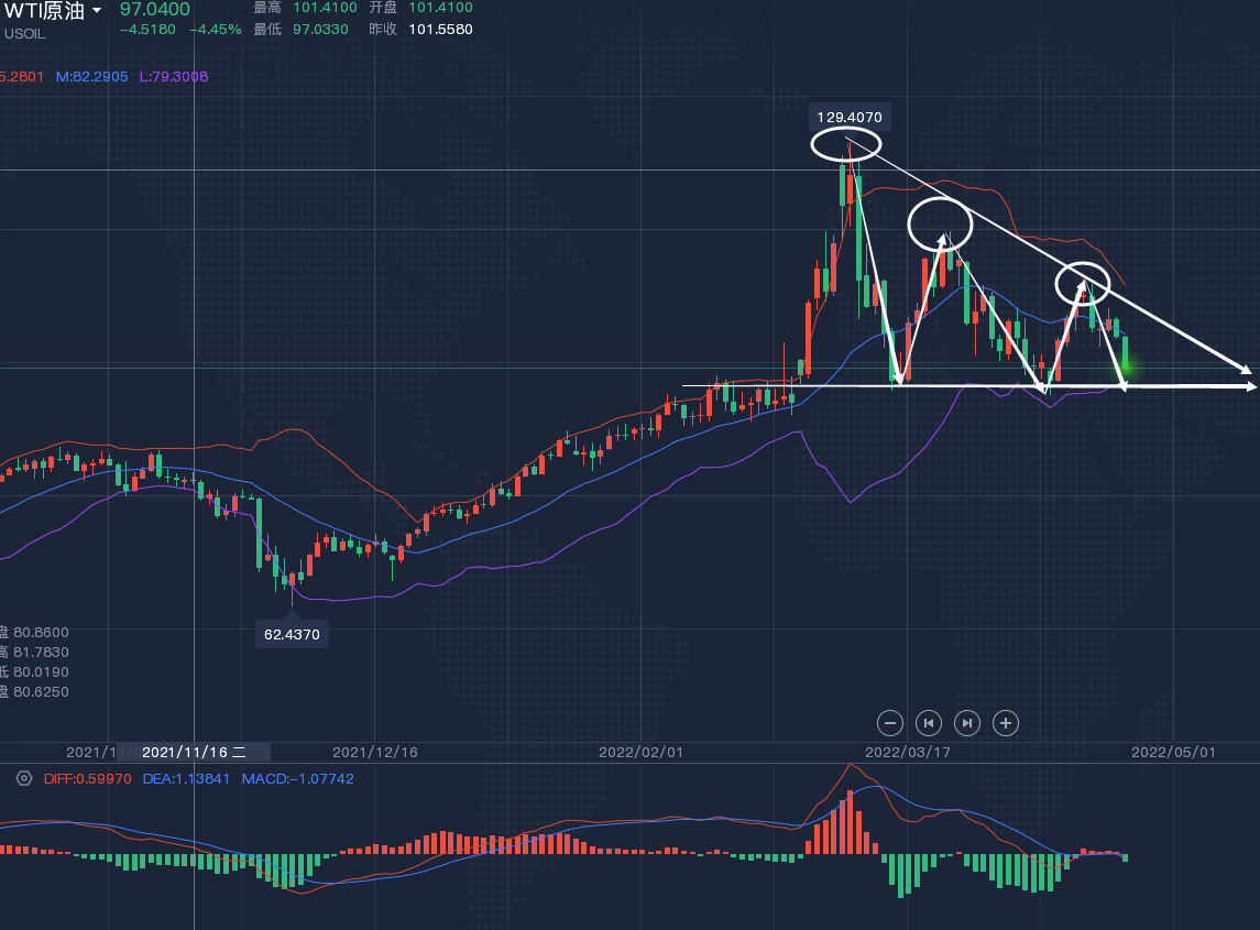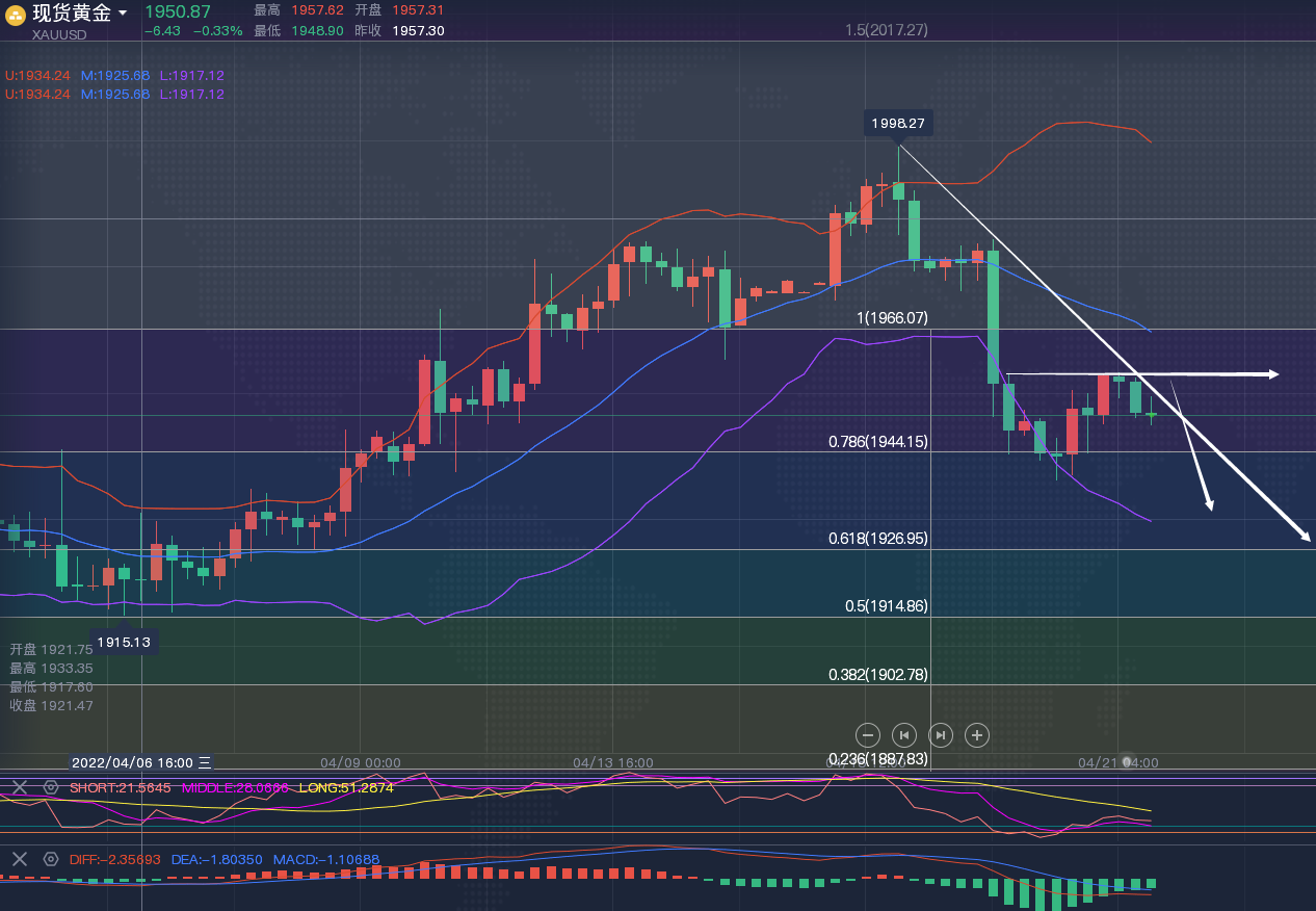 大家好,依旧是奋斗在一线的云宸给大家带来最新金油策略! 4月21日 星期四 赠言:成功不是将来才有的,而是从决定去做的那一刻起,持续累积而成。 ---4.21黄金日内分析如下: ①、黄金一波未平一波又起,在本周未冲破右肩阻力2000关口走下跌,进入了弱势格局,这奠定了肩部压制成功的同时空头机构纷纷出逃,黄金后市将还有低点,别看目前在1950区域震荡,蓄势待发小修正大跳水。而且今日突发信息:乌克兰向俄无条件请求谈判,恐怕战事将完结,也就是说这唯一的避险利多金价的苗头也将被熄灭,下一步将进入加息缩表控制盘面冲击1890支撑了。 ②、浅谈盘面:目前金价触右肩顶部后低点是在逐步降低的(1998-19