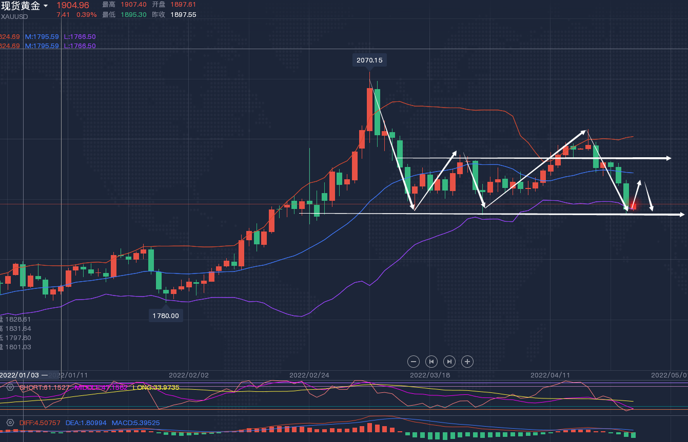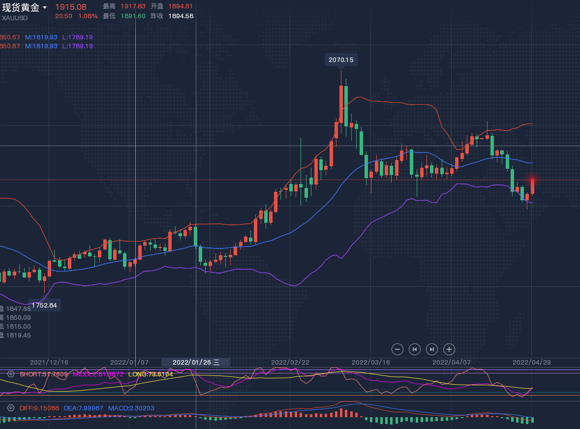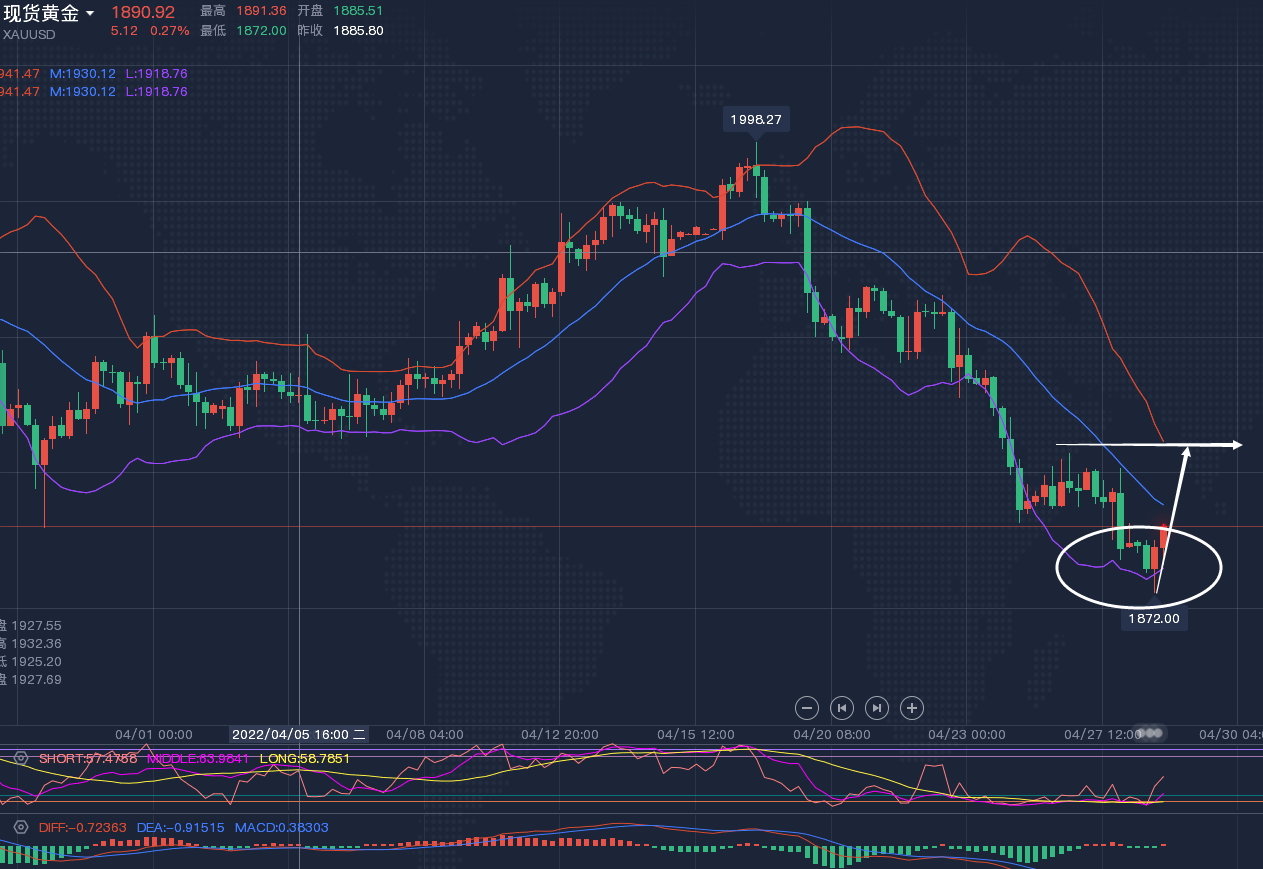 大家好,依旧是奋斗在一线的云宸给大家带来最新金油策略! 4月29日 星期五 赠言:成功不是将来才有的,而是从决定去做的那一刻起,持续累积而成。 ---4.29黄金日内分析如下: ①、黄金验证昨日思路,反攻号角响起,目前已顺利冲高1915一带震荡。解析走高的原因:第一加息缩表的利空炒作太久了,行情也是给出了下跌的幅度,但加息没有真正落地,市场做空的心还悬在半空中,所以出现反弹是必然。第二:技术面中1870一带是前顶底转换位,下跌此位企稳快速反弹表明支撑极强,同时RSI超卖严重,最重要的是日线收阳包阴形态,打破了极弱格局,连续利好之下今日黄金的布局思路就是低多去对待。 ②、回归重点,进场点位的问