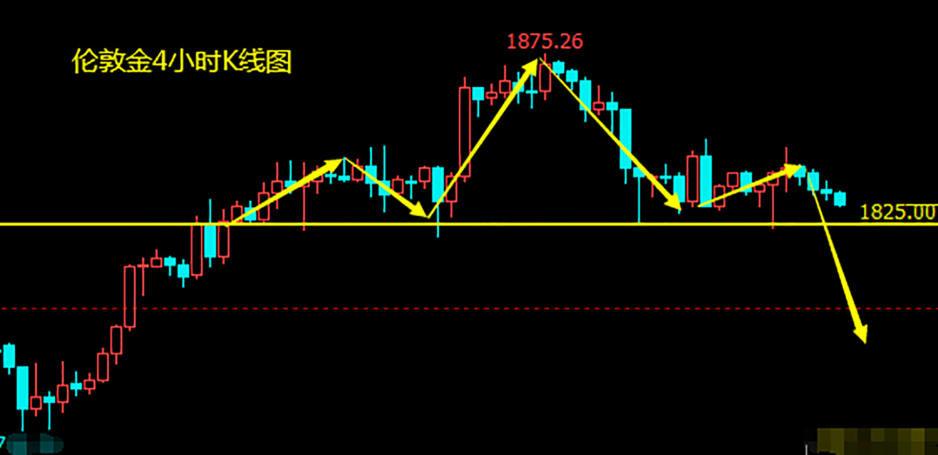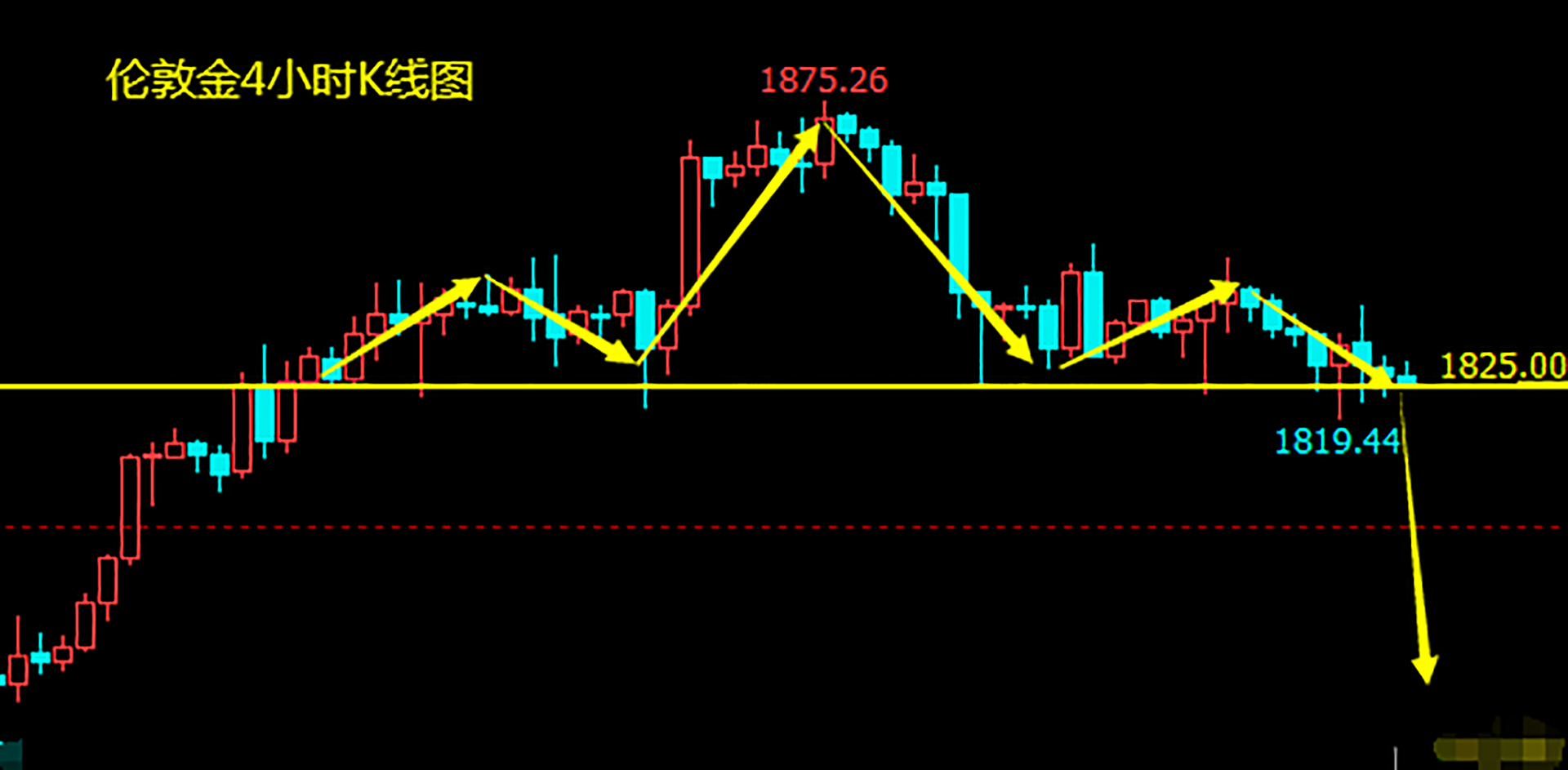 在今天上午的黄金评论中,我们给出了做空黄金的策略,目前该策略已触及1825的止盈位。下面我们对黄金下一步的走势做一下分析、预测。 技术分析而言,伦敦金4小时K线走势,已经完成了头肩顶形态的构建。短线走势而言,预计会在颈线位置(1825一线)做震荡整理走势。整理结束后,大概率将继续下行。 操作策略 伦敦金价格下破1825后追空,止盈1808,止损1830。 以上内容仅供参考,不作为交易依据。