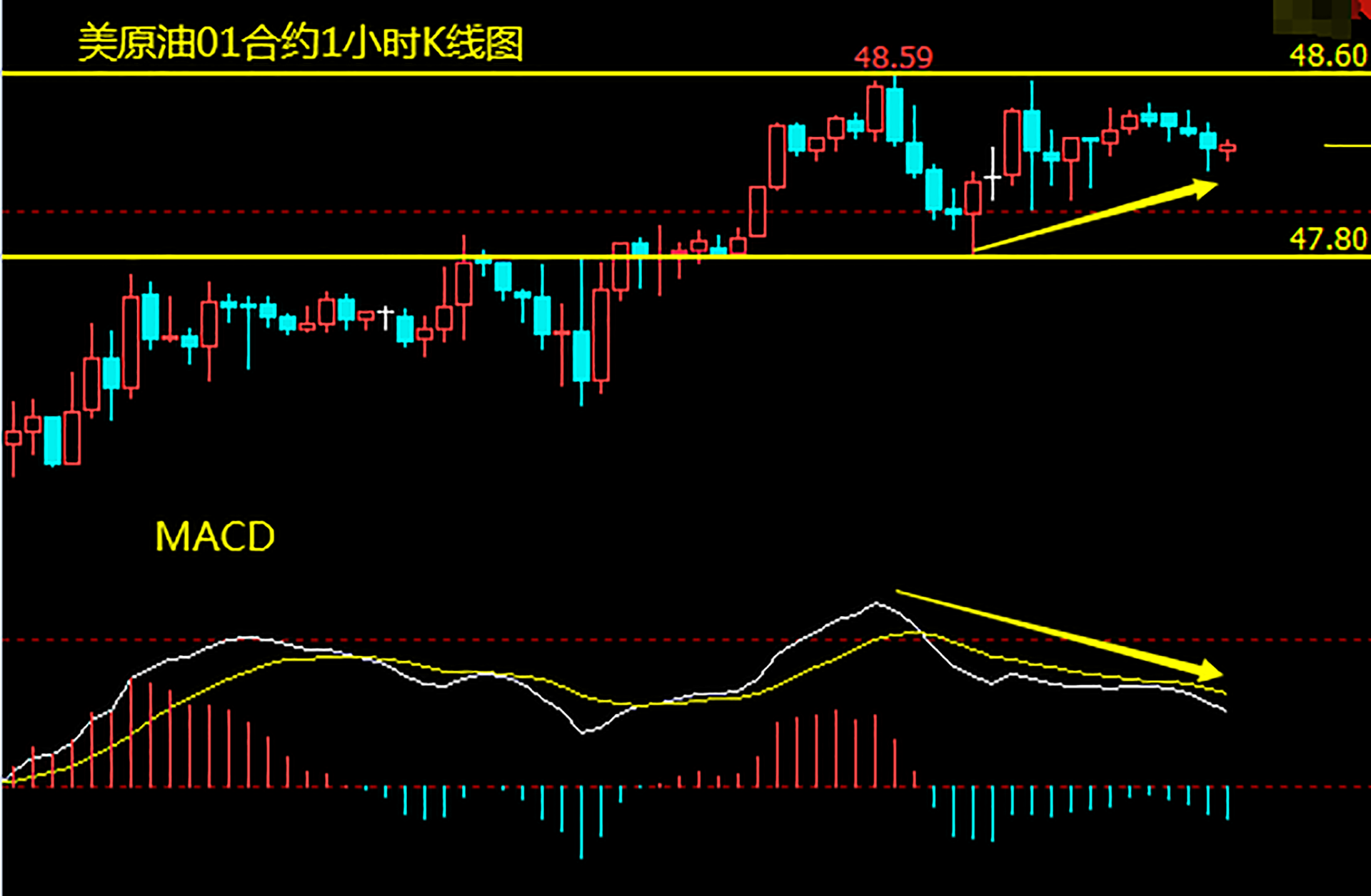 昨日回顾 受周三晚盘时段公布的EIA库存数据减少影响,昨日美油价格再次拉升。截止昨日美油已经连续4个交易日、5周出现上涨。短期指标已经出现超买状态。预计短期内价格将出现整理走势。但因供需关系支撑油价上行的因果关系并未改变。故预计短线走势调整结束后,仍将重回上行走势。但需注意的是,圣诞、新年假期临近。市场上动能减少,亦或不能在调整结束后支撑油价大幅上行。 日内分析 技术分析而言,美原油1小时周期的压力位位于48.60一线(前期高点附近)、短期的支撑位位于47.80一线(前期低点附近)。K线形态与MACD指标形成底背离,后市价格或将出现下行走势。 操作策略 48.25附近做空美原油,止盈47.8