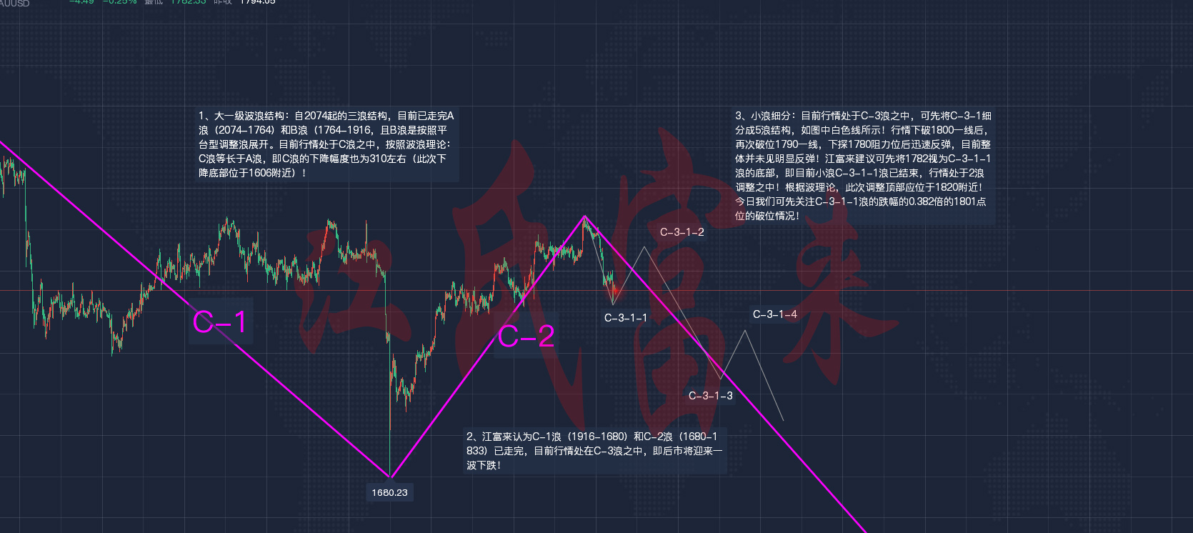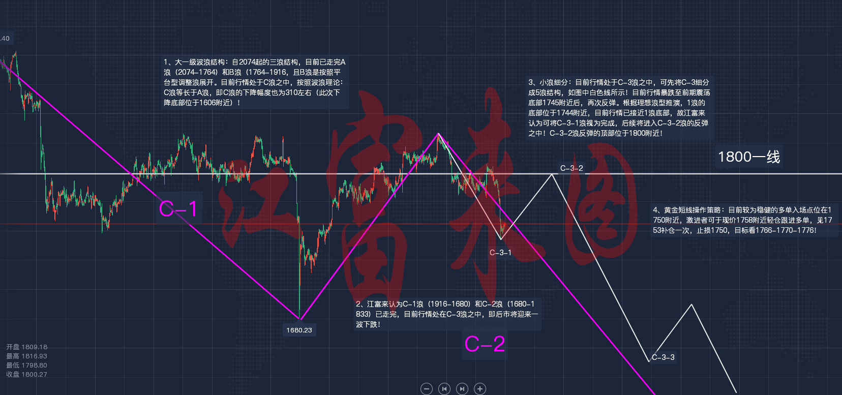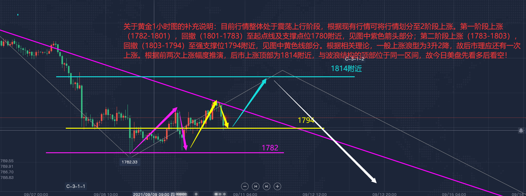 黄金现货行情分析: 早间及午间笔者江富来已对今日行情做了较为详细的分析,这里就不在赘述。目前对1小时周期行情做一点补充说明(图解见下图): 关于黄金1小时图的补充说明:目前行情整体处于震荡上行阶段,根据现有行情可将行情划分至2阶段上涨。第一阶段上涨(1782-1801) ,回撤(1801-1783) 至起点线及支撑点位1780附近,见图中紫色箭头部分;第二阶段上涨(1783-1803)回撤(1803-1794) 至强支撑位1794附近,见图中黄色线部分。根据相关理论,一般上涨浪型为3升2降,故后市理应还有一次上涨。根据前两次上涨幅度推演,后市上涨顶部为1814附近,与波浪结构的顶部位于同一区