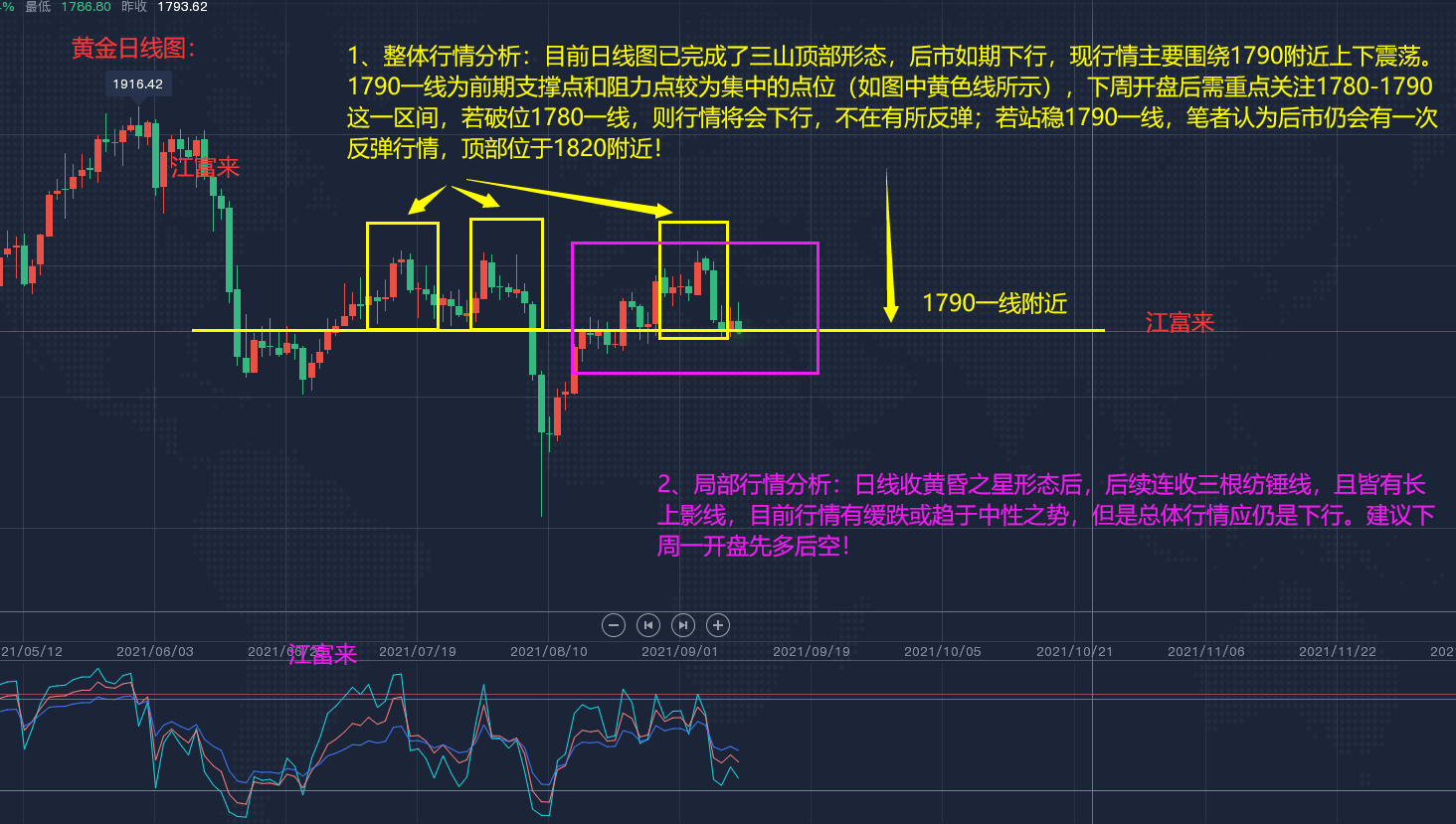 黄金现货行情分析: -----裸k方面信号及分析:------ 黄金日线图: 1、整体行情分析∶目前日线图已完成了三山顶部形态,后市如期下行,现行情主要围绕1790附近上下震荡。1790一线为前期支撑点和阻力点较为集中的点位(如图中黄色线所示),下周开盘后需重点关注1780-1790这一区间,若破位1780一线,则行情将会下行,不在有所反弹;若站稳1790一线,笔者认为后市仍会有一次反弹行情,顶部位于1820附近! 2、局部行情分析:日线收黄昏之星形态后,后续连收三根纺锤线,且皆有长上影线,目前行情有缓跌或趋于中性之势,但是总体行情应仍是下行。建议下周一开盘先多后空! 黄金1小时图 1、黄金