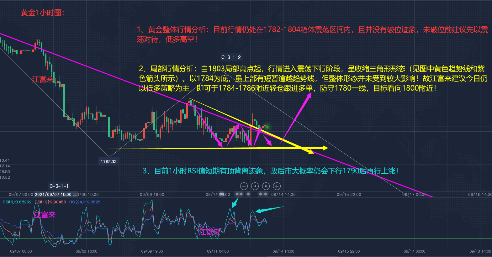 黄金现货行情分析: 早间及午间笔者江富来已对今日行情做了较为详细的分析,这里就不在赘述。目前对1小时周期行情做一点补充说明( 图解 见下图): 1、整体行情解读:如早间笔者江富来分析所说,由于1小时周期/4小时周期的RSI值与行情形成底背离之势,故后市或将触底反弹!今日白盘黄金震荡上行,目前破位1800—线后,再次盘整于1798附近! 2、黄金局部行情承压于1801阻力之下,目前未构成三山顶部形态,且RSI值并未于行情形成顶背离之势,故后市仍可继续看1涨!结合波浪结构,稳健者可观望1801一线破位情况,激进者可于现价1790附近轻仓跟进多单,止损1790,目标1806-1814! 3、目前行