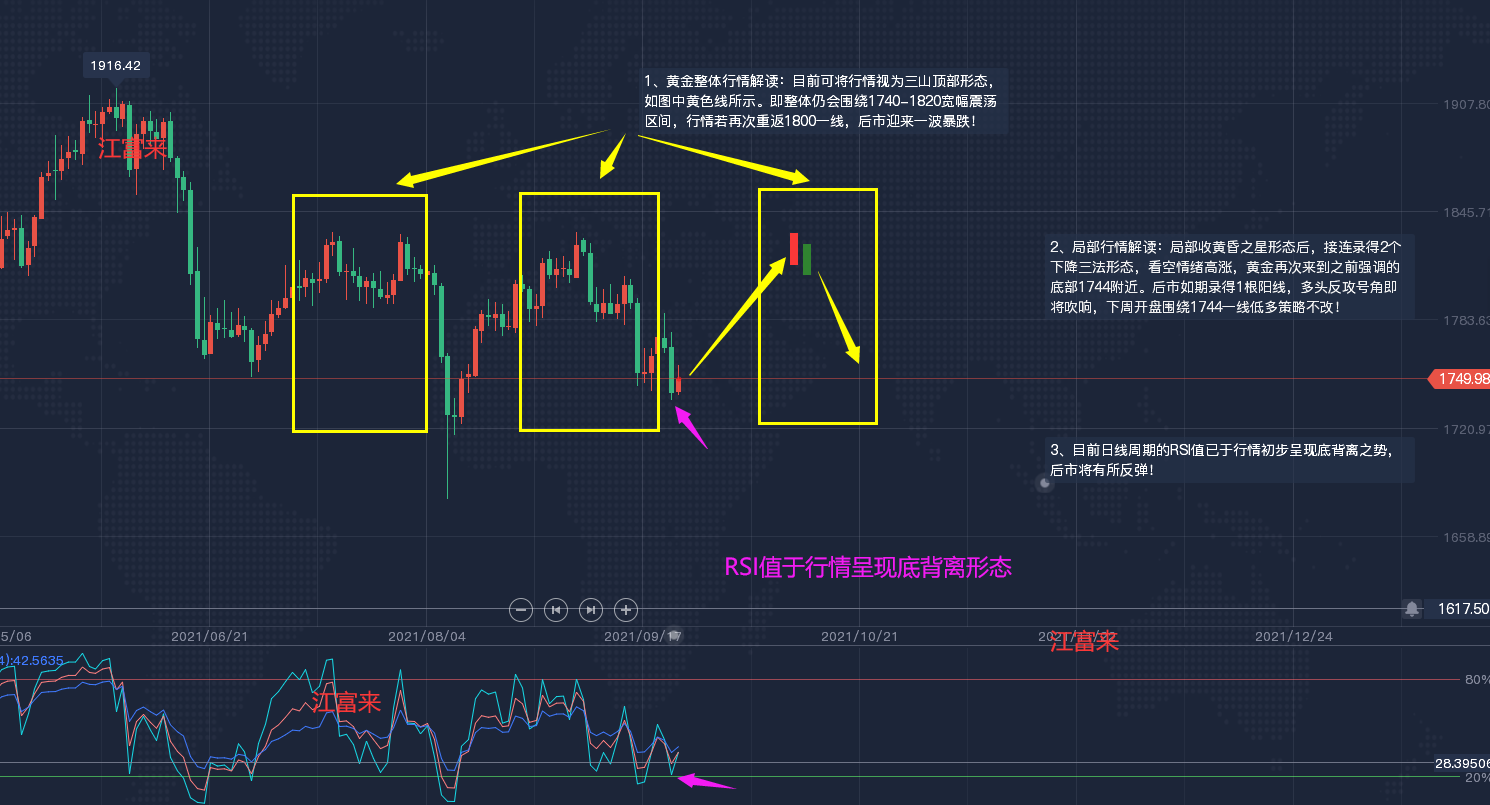 黄金现货行情分析: -----裸k方面信号及分析:------ 黄金日线图: 1、黄金整体行情解读:目前可将行情视为三山顶部形态,如图中黄色线所示。即整体仍会围绕1740-1820宽幅震荡区间,行情若再次重返1800一线,后市迎来一波暴跌! 2、局部行情解读:局部收黄昏之星形态后,接连录得2个下降三法形态,看空情绪高涨,黄金再次来到之前强调的底部1744附近。后市如期录得1根阳线,多头反攻号角即将吹响,下周开盘围绕1744一线低多策略不改! 3、目前日线周期的RSI值已于行情初步呈现底背离之势,后市将有所反弹! 黄金1小时图 1、整体行情解读:行情多次试探1740一线并未站稳,整体形成了圆顶