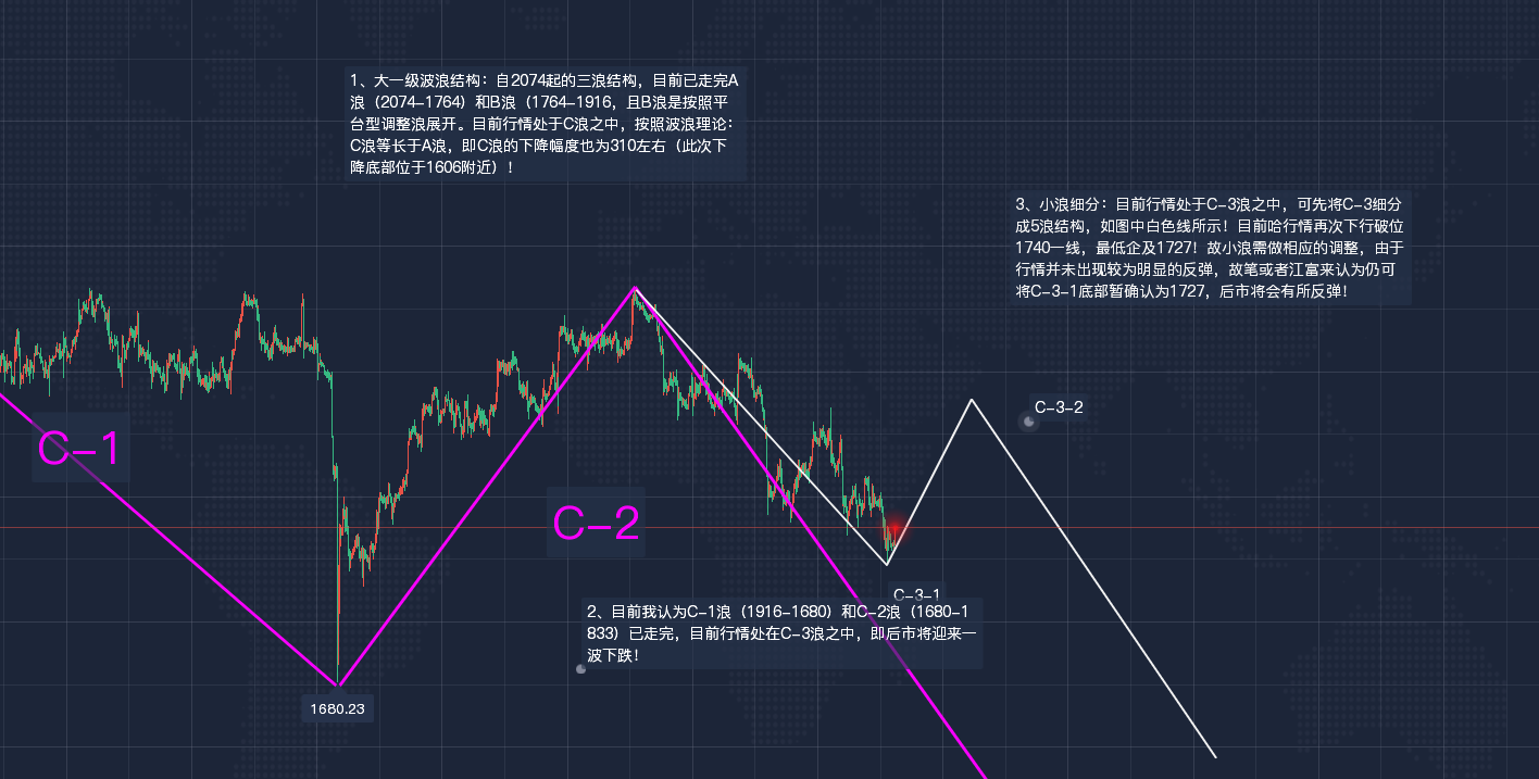黄金现货行情分析: -----裸k方面信号及分析:------ 黄金日线图: 1、黄金整体行情解读:目前可将行情视为三山顶部形态,如图中黄色线所示。即整体仍会围绕1680-1830宽幅震荡区间,行情若再次重返1800一线,后市迎来一波暴跌! 2、局部行情解读:局部收黄昏之星形态后,接连录得3个下降三法形态,看空情绪高涨,黄金已破位1740一线,目前盘整于1730-1740区间内!本周后3个交易日行情仍将继续围绕1740这一多空分水岭点位!若无法站稳1740-1744区间,后市仍将会有一次下行,再次构成第4个下降三法形态! 3、目前日线周期的RSI值已于行情初步呈现底背离之势,后市将有所反弹!