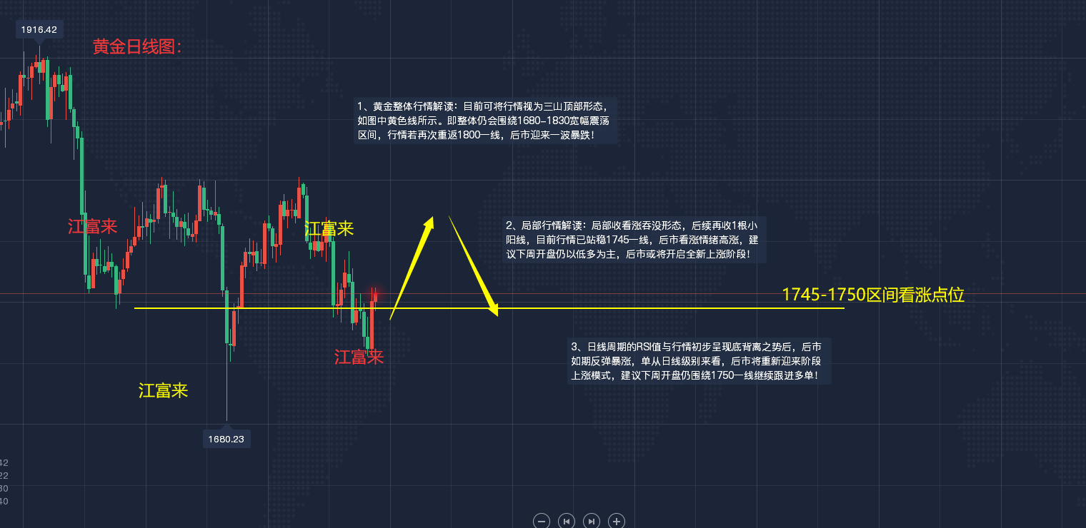 黄金现货行情分析: -----裸k方面信号及分析:------ 黄金日线图: 1、黄金整体行情解读:目前可将行情视为三山顶部形态,如图中黄色线所示。即整体仍会围绕1680-1830宽幅震荡区间,行情若再次重返1800一线,后市迎来一波暴跌! 2、局部行情解读:局部收看涨吞没形态,后续再收1根小阳线,目前行情已站稳1745一线,后市看涨情绪高涨,建议下周开盘仍以低多为主,后市或将开启全新上涨阶段! 3、日线周期的RSI值与行情初步呈现底背离之势后,后市如期反弹暴涨,单从日线级别来看,后市将重新迎来阶段上涨模式,建议下周开盘仍围绕1750一线继续跟进多单! 黄金4小时/1小时图信号解读: 1、整