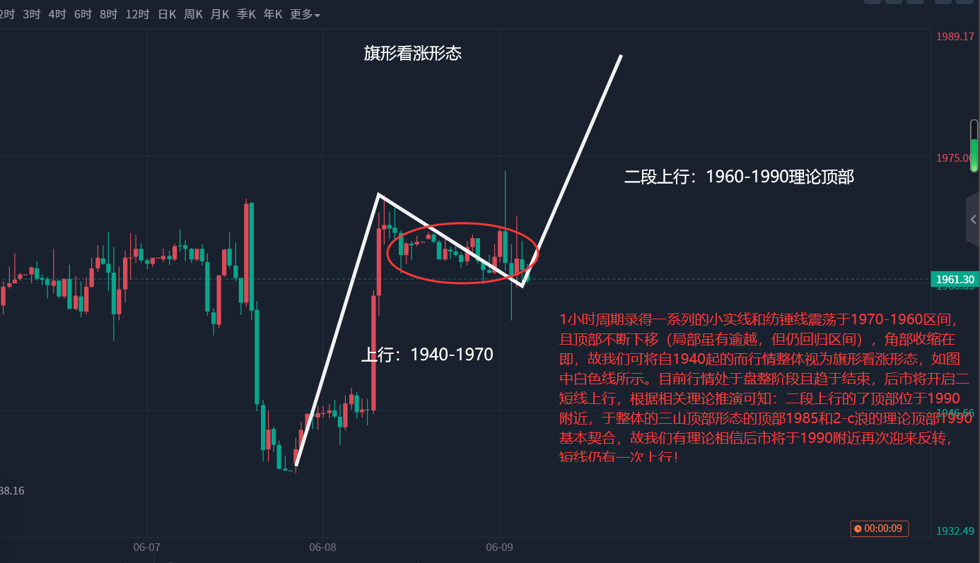 黄金走势分析 盘面分析: 1小时周期录得一系列的小实线和纺锤线震荡于1970-1960区间且顶部不断下移 (局部虽有逾越,但仍回归区间),角部收缩在即,故我们可将自1940起的而行情整体视为旗形看涨形态,如图中白色线所示。目前行情处于盘整阶段且趋于结束,后市将开启二短线上行,根据相关理论推演可知:二段上行的理论顶部位于1990附近,于整体的三山顶部形态的顶部1985和2-c浪的理论顶部1990基本契合,故我们有理论相信后市将于1990附近再次迎来反转,短线仍有一次上行!4小时周期录得大阳构筑塔形底部形态后,后续录得一系列的纺锤线呈震荡,但行情依旧站稳于中轨之上,短线仍有上行动能!日线周期局部