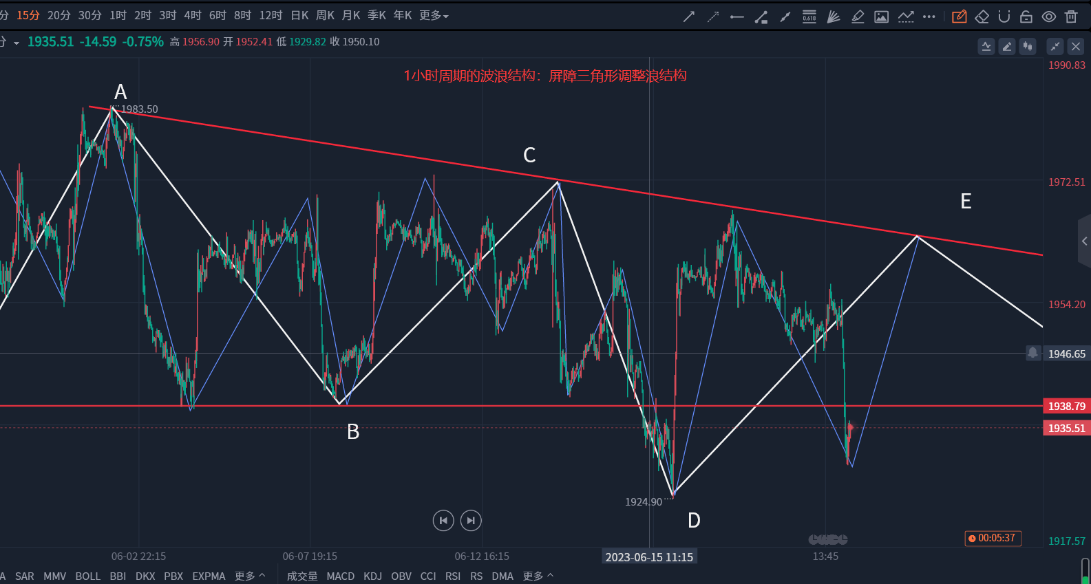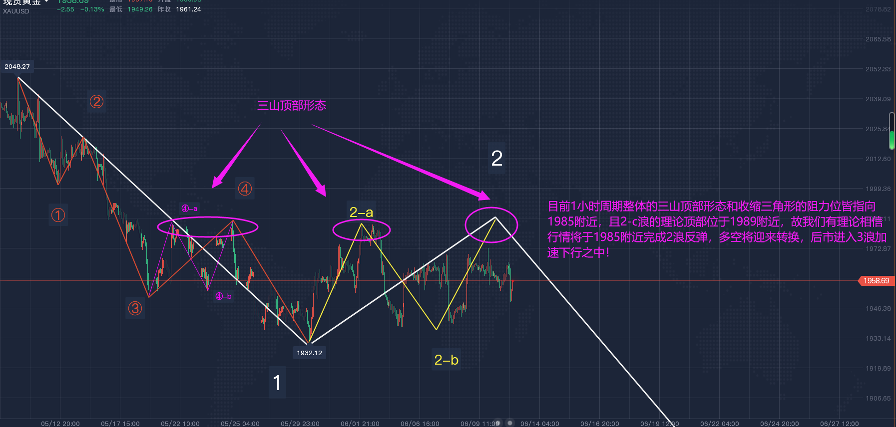 黄金走势分析 1、1小时周期局部于1933附近构筑黄昏之星形态后,后续再次再次于1933附近构筑塔形顶部形态,整体构筑双顶形态,后市可看下行;现行情收小实线和纺锤线震荡下行破位1小时中轨,局部再次呈圆顶形态,且受阻于中轨,短线亦看下行,建议后市高空为主!4小时周期于阻力位1933附近录得大阴构筑黄昏之星形态,后续录得1根小阴线和十字线触及中轨,短线反弹已结束,后市可看下行。日线周期整体于2040附近录得圆顶形态,后市整体处于大空趋势之下;局部破位前市箱体震荡1970-1940区间,短线亦看下行。 2、波浪结构分析:因行情下破1924一线,故小浪结构破坏,即行情已完成2浪反弹已完成,行情正处于