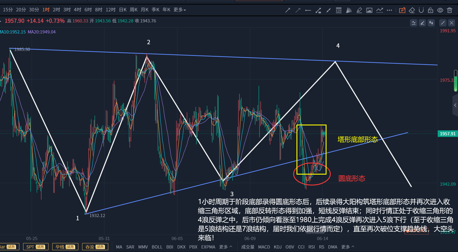 黄金走势分析 盘面分析: 1小时周期于阶段底部录得圆底形态后,后续录得大阳构筑塔形底部形态并再次进入收缩三角形区域,底部反转形态得到加强,短线反弹结束,同时行情正处于收缩三角形的4浪反弹之中,后市仍倾向看涨至1980上完成4浪反弹再次进入5浪下行(至于收缩三角是5浪结构还是7浪结构,届时我们依据行情而定),直至再次破位支撑趋势线,大空头来临!4小时周期整体处于1940-1964箱体震荡之中,现于箱体震荡底部再次录得塔形底部形态,短线仍有上行寻找顶部甚至前高的动能,建议尾盘顺势看多为主!上方关注1964-1984阻力,下方关注今日多空转换点1950支撑,破位看1940-1910! 目前1小时周