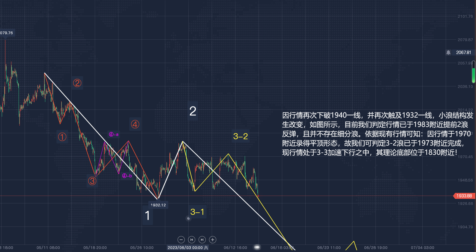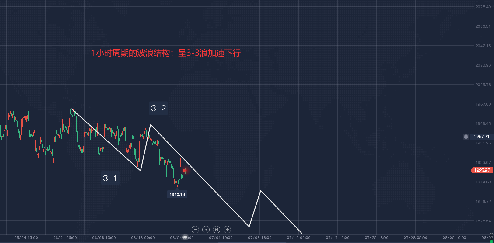 黄金走势分析 盘面分析: 小时线级别波浪结构: 因1小时周期再次收阴破位1940一线,最低企及1932一线,故我们需对小浪结构做出调整。依据现有行情可知:2浪或已于1983提前走完,且2浪为简单浪,并不存在细分浪,现行情整体处于3浪下行之中。因行情于1970附近录得平顶形态,故我们可判定3-2浪已于1970附近结束,现行情整体处于3-3浪加速下行之中,根据波浪理论推演可知:3-3浪理论底部位于1830附近,后市整体可看下行。 小浪细分: 小浪细分: 由大级别的波浪和之前分析可知,目前行情处于3-3-2反弹之中,且根据波浪理论推演可知,3-3-2浪理论反弹顶部位于1954附近,至于3-3-2浪