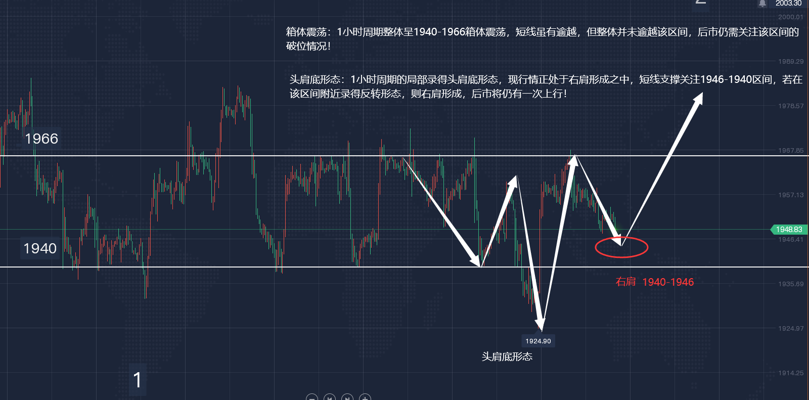 黄金走势分析 盘面分析: 1、箱体震荡:目前1小时周期的行情整体呈1940-1966箱体震荡,短线虽有逾越,但整体仍处于该区间之中,箱体震荡区间仍有效,后市仍需关注其破位方向;同时因行情整体处于下行趋势之中,故后市大概率的破位方向为下行,高位谨慎追多! 2、头肩底形态:1小时周期的局部录得头肩底形态,现行情正处于右肩形成之中,短线支撑关注1946-1940区间,若在该区间附近录得反转形态,则右肩形成,故短线将仍有一次上行! 3、指标分析:1小时周期的Ma均线交叉向下指向看跌,但目前行情整体处于箱体震荡之中,其指向效用有限,故短线需参考其他指标。1小时周期的KDJ的交叉向下指向看跌,但15分钟