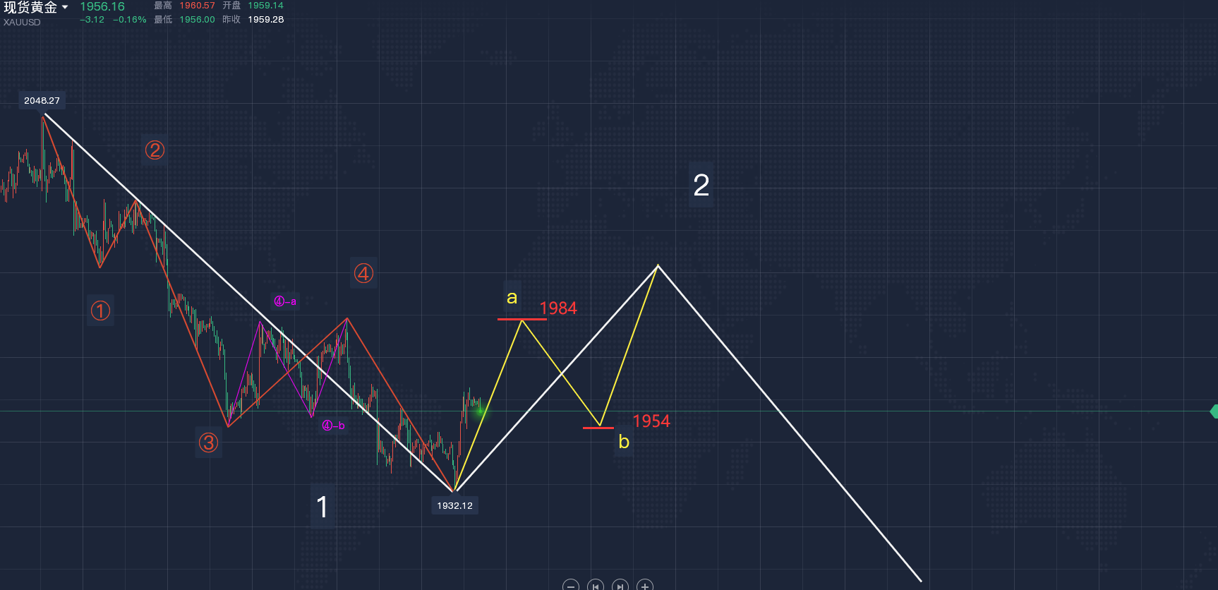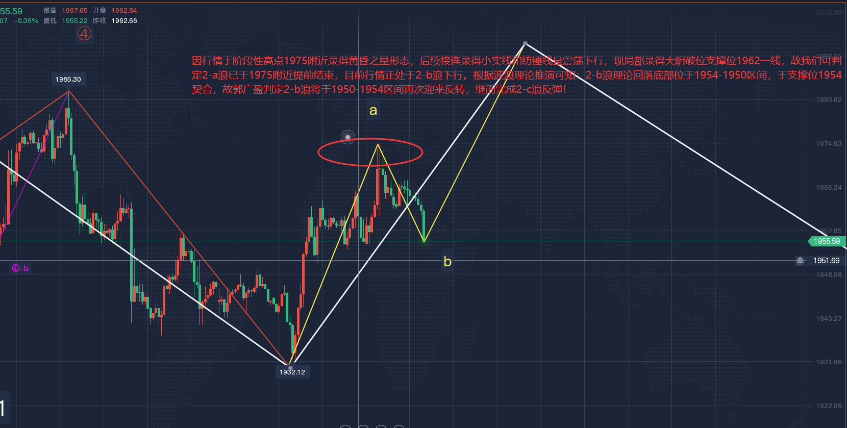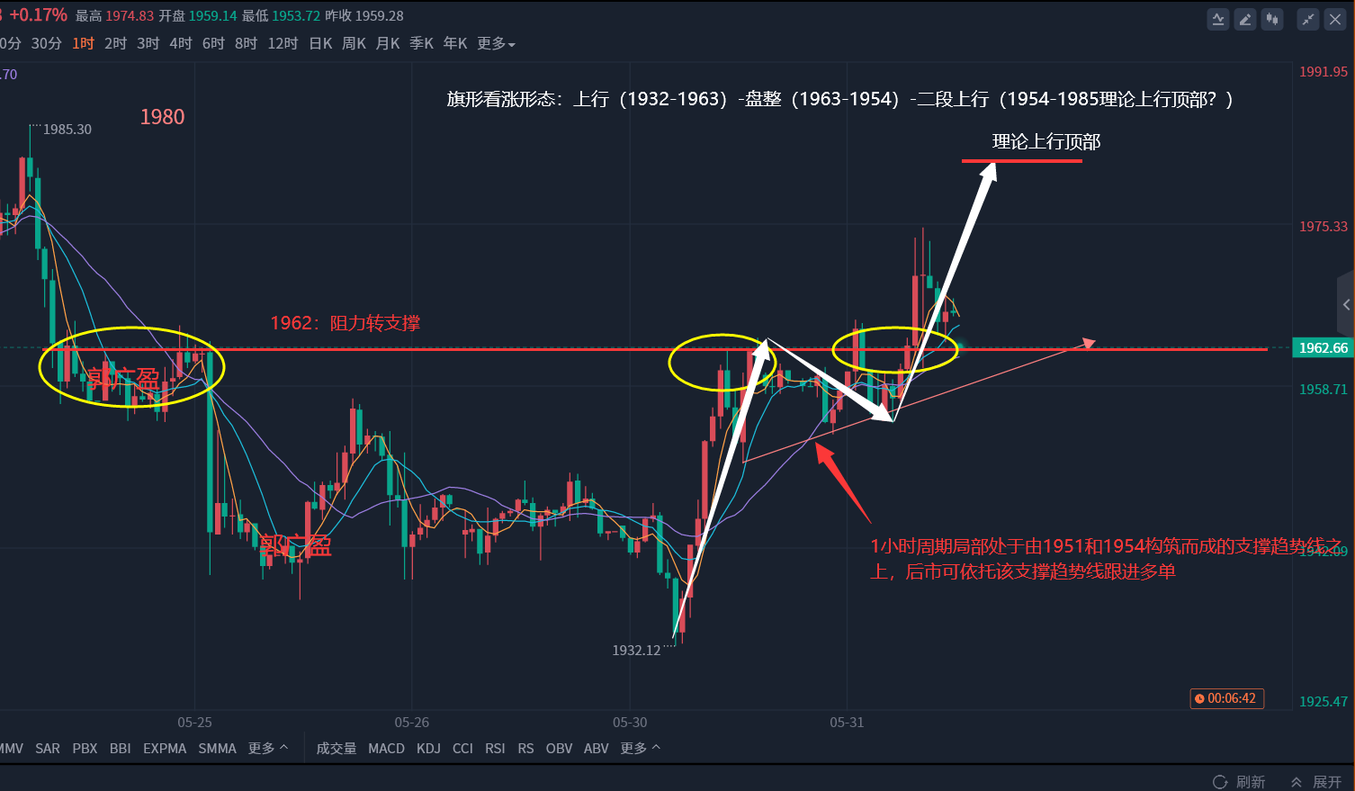 黄金走势分析: 盘面分析: 1、旗形看涨形态:自1932起的行情整体可视为旗形看涨形态,如图中白色箭头所示,即上行(1932-1963)-盘整(1963-1954)-二段上行(1954-1985理论上行顶部),依据现有行情和相关理论推演可知:二段上行的理论顶部位于1985附近,于阻力位1984契合。 2、支撑趋势线:目前1小时周期局部处于由1951和1954构筑而成的支撑趋势线之上,后市可依托该支撑趋势线继续跟进多单! 3、关于1962这一点位的说明:1962作为前市强阻力位,目前行情收阳破位该点位,故根据极性转换原则:目前已转换成短线支撑,即今日可依托1962一线跟进多单! 4、其他周