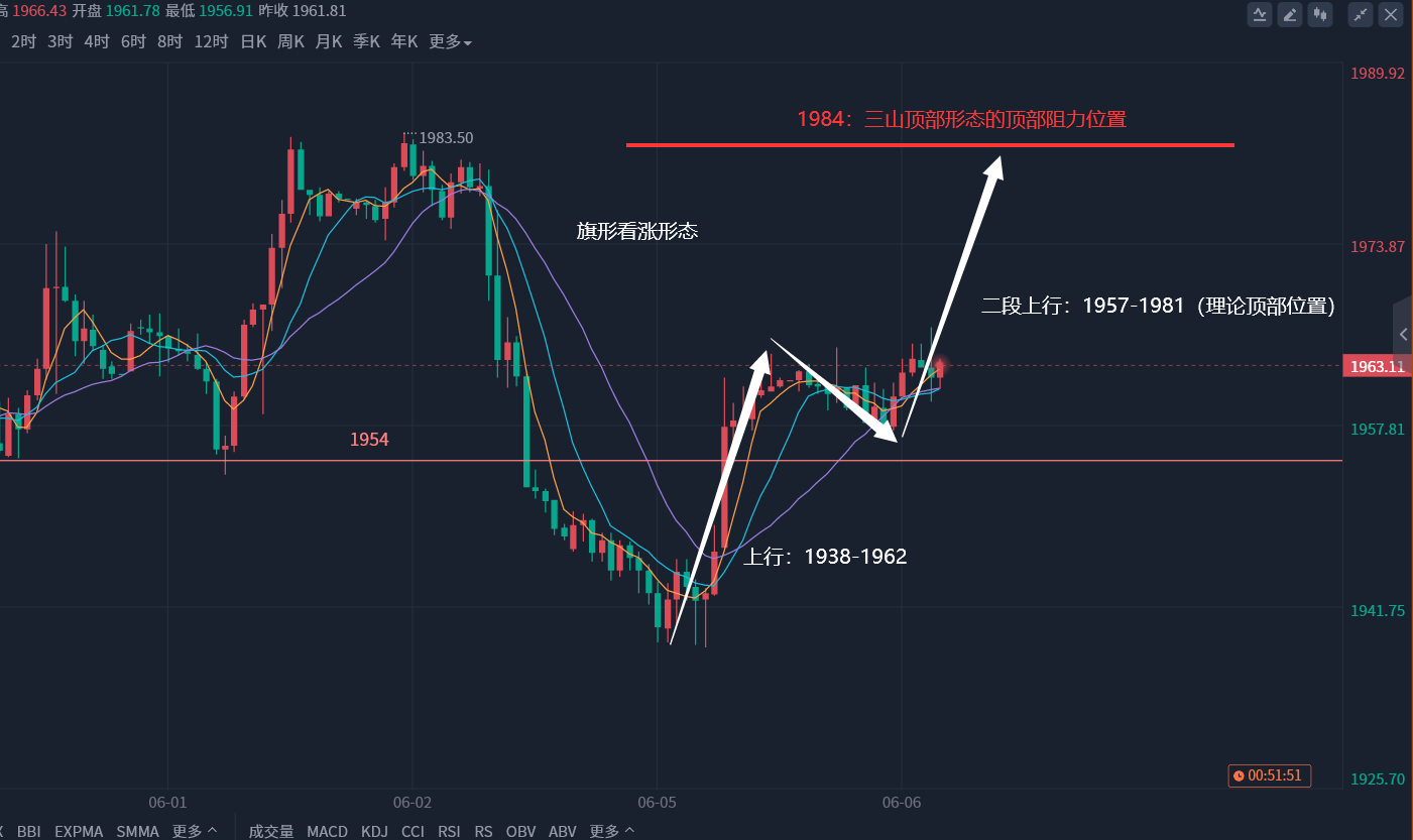 黄金走势分析: 盘面分析: 1、裸k信号:1小时周期局部于1962附近录得一系列的纺锤线和小实线呈盘整,后于中轨附近再次录得阳线构筑看涨吞没形态,目前接连录得小阳线呈震荡上行,底部支撑1957强劲,同时高点不断上移,故我们整体可判定行情为震荡上行。4小时周期于阶段性底部1938附近录得塔形底部形态,目前录得一系列的纺锤线和小实线呈震荡上行并破位中轨,短线可看上行,行情仍将会上行试探三山顶部形态的顶部阻力位1984一线,故后市整体可看上行。 2、旗形看涨形态:自1937起的行情整体可视为旗形看涨形态,如图中白色线所示,即上行(1938-1962)-盘整(1962-1957)-二段上行(1957