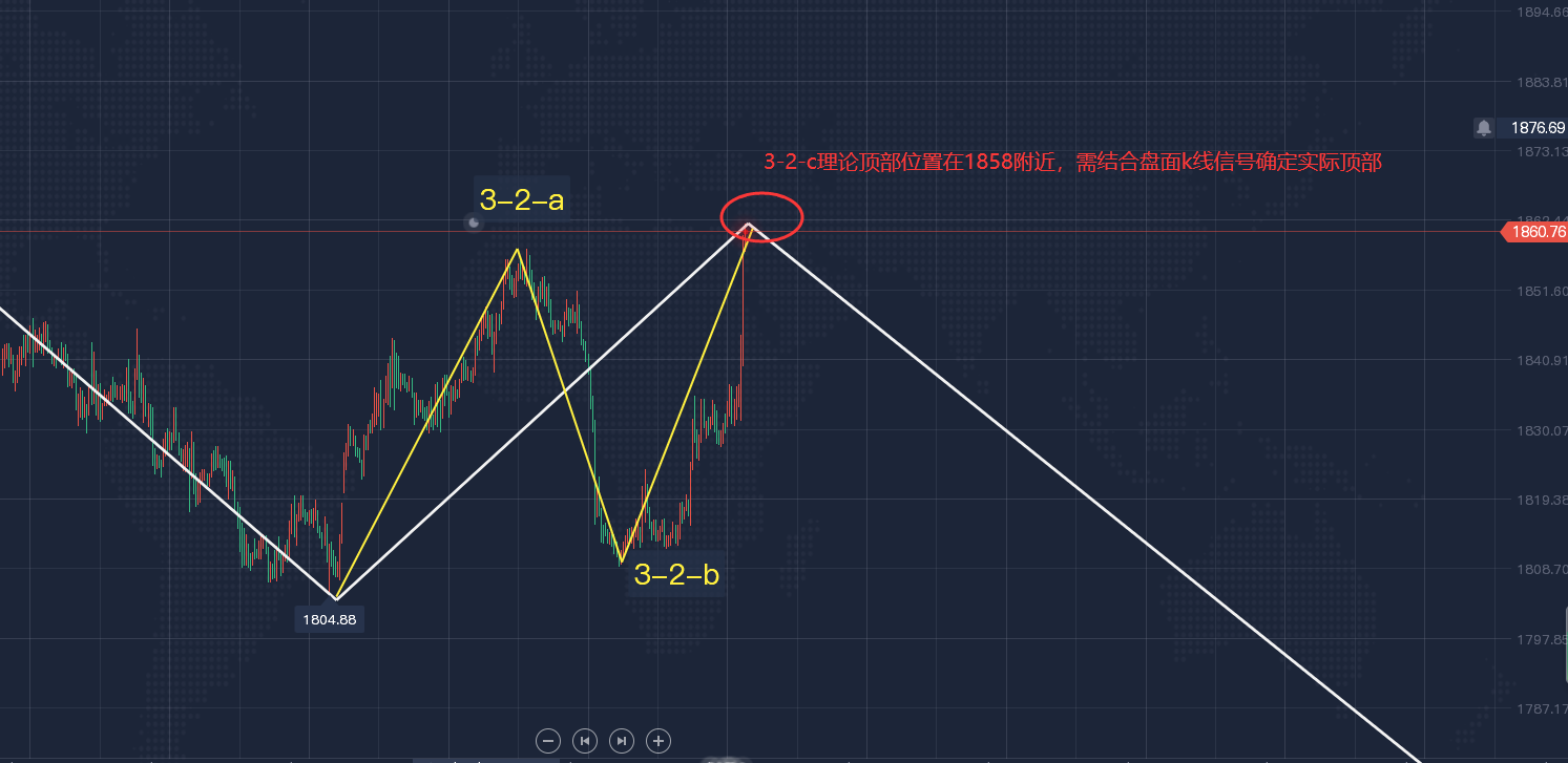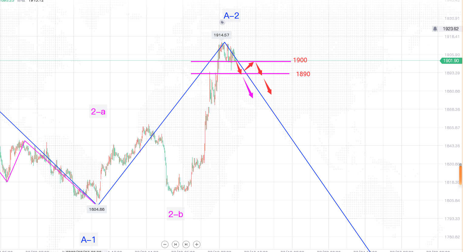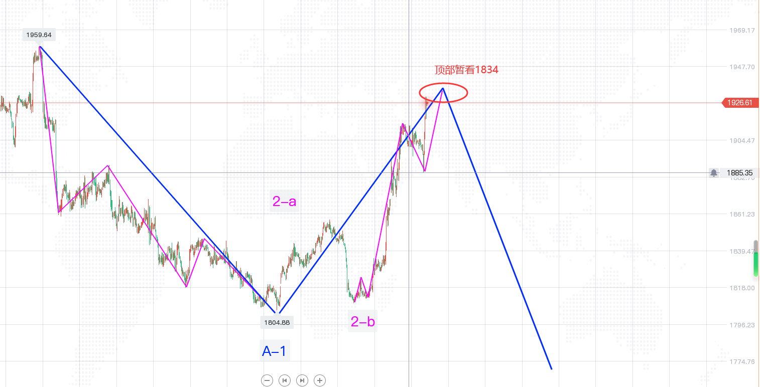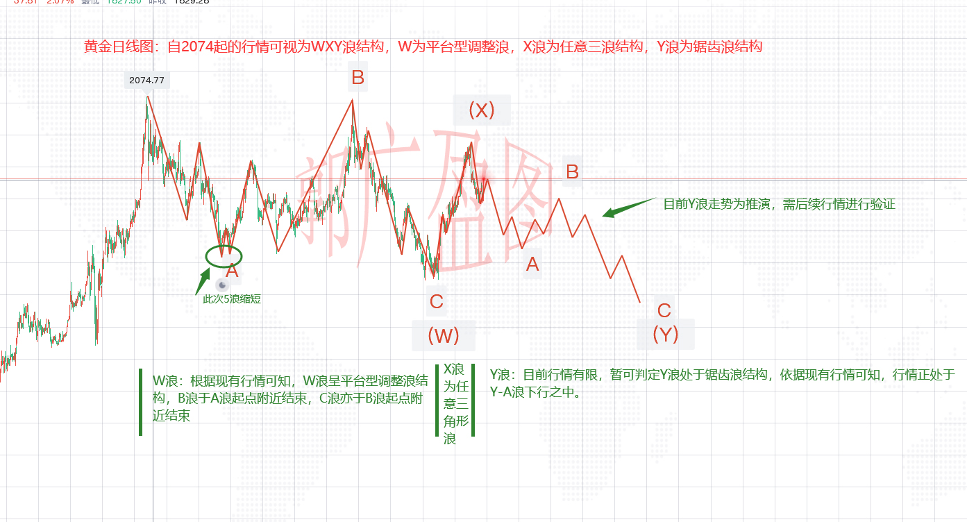 黄金走势分析: 黄金波浪结构分析: 大一级别的波浪结构:自2074起的行情目前整体判定处于双重锯齿浪WXY之中,如图中红色线所示。依据现有行情可知,目前行情已走完大级别的W浪(W浪呈平台型调整浪结构)和X浪(任意三浪结构),即自1959起的行情可视为Y浪下行(目前暂判定为锯齿浪ABC结构),详见日线周期波浪结构图示。根据波浪理论推演可知:Y浪理论下行底部位于1500附近! Y浪细分:根据现有行情可知,目前行情整体处于Y-A浪下行之中,为方便分析,我们可将A浪继续细分成5浪结构,如日线大级别结构所示。现日线于1804附近录得启明星形态,后续收一系列的k线上行,故可判定A-1浪结束。为方便分析和