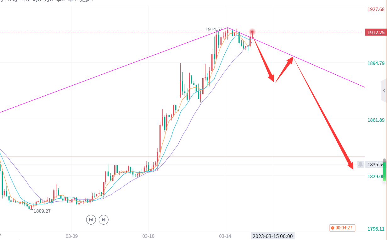 黄金走势分析: 关于欧美盘时段黄金的几点补充说明: 1、1小时周期于1914附近录得一系列的纺锤线和小实线呈震荡,后收阴构筑塔形顶部形态,后续接连录得阴线触及中轨,ma均线趋于交叉粘合,多空将再次迎来转换,空头重返,后市可看下行!4小时周期于阶段性高点1914录得黄昏之星形态,后市可看下行,反弹接空!目前1小时周期的Ma均线交叉粘合,多空将再次迎来转换,建议1910上方谨慎接多!1小时周期和15分钟周期的KDJ交叉向上指向看涨,短线有反弹动能,但目前15分钟周期的KDJ已触及超卖分界线,为后市下行奠基。1小时周期的RSI并未随行情新高而创新高,呈顶背离,后市可看下行。建议上方关注1920-1