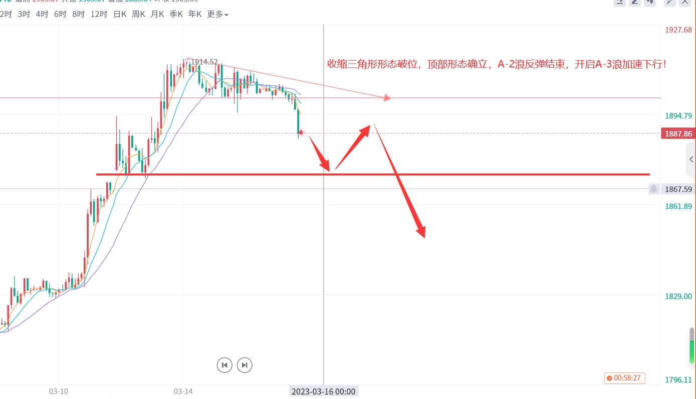 黄金走势分析: 目前1小时周期录得中阴破位1900一线后再次录得大阴,收缩三角形破位,行情整体于1914附近录得圆顶形态,于阶段性高点录得反转形态,后市整体可看下行!4小时周期于阶段性高点1914附近录得阴阳线震荡筑平顶,后续接连录得长上影线和纺锤线及阴线呈震荡下行,现再次酝酿大阴触及中轨,整体构筑塔形顶部形态,后市多空将再次迎来转换,空头再次重返市场!根据极性转换原则可知:1866-1872为本周跳开缺口,目前已转换成后市短线支撑,后市需关注该区间的支撑情况! 目前1小时周期的Ma均线已走出交叉粘合,现交叉向下指向看跌,后市整体可看下行!1小时周期和15分钟周期的KDJ交叉向下指向看跌,但