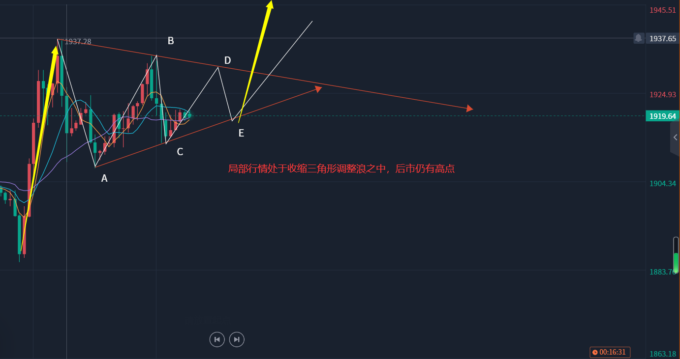 黄金走势分析: 1小时周期于阶段性高点1937附近录得看跌吞没形态,后续再次录得下降三法形态,看跌形态叠加且行情再次触及中轨,后市多空将再次迎来反转,空头重返!4小时周期于阶段性高点1937附近录得大阴构筑看跌吞没形态,后续录得小阳且再次酝酿大阴触及中轨,高位谨慎追多!日线周期局部录得小阴后再次录得阳线,局部呈高位震荡,多空暂不明朗。 目前1小时周期的Ma均线交叉向上指向看涨,但目前收阴已跌破中轨,均线将再次趋于交叉粘合,建议谨慎追多!1小时周期和15分钟周期的的KDJ交叉向下指向看跌,但目前均已触及超卖分界线,后市需关注其超卖状态的解除方式!1小时周期的RSI随行新高而创新高,呈顶背离,后