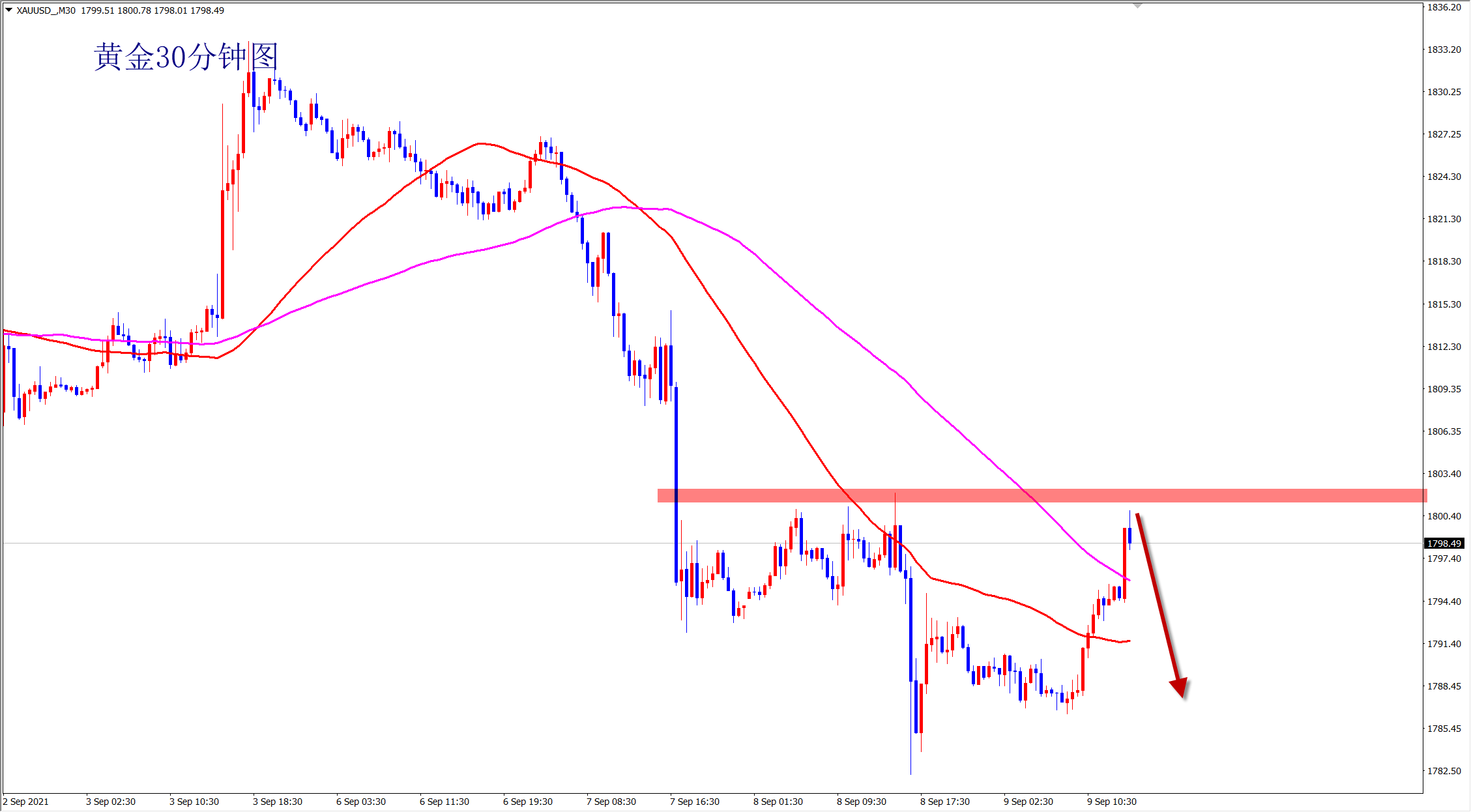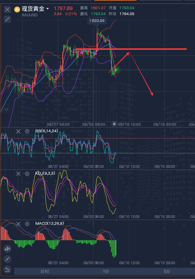 实力是盈利的基础,稳健是获利的根本!大家好,我依然是活跃在投资一线的黄金分析师方锦鑫。有句话说的好箭在弦上不得不发,黄金投资也一样,既然进入市场必定不能无功而返,做投资不是一朝一夕的事,没有一条路走到黑的行情,更没有一直亏损的投资,行情反反复复,操作亏亏赚赚,这个市场不会偏袒任何人,一时的亏赚并不能决定成败,亏损了就赚回来,谁笑到最后才是赢家。 消息面: 9月8日,国际金价承压1800,因美元指数维持反弹势头,刷新一周高位至92.630。金价隔夜创下近一个月来最大单日百分比跌幅。纽约联储报告称,对劳动力市场的预期在继续改善,预计未来四个月接到工作邀请的可能性和对邀请提供薪资的预期均在上升。