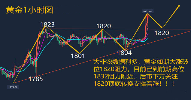 利润才是检验实力的标准,不管分析报告多么的专业,还是文章读起来多么的深入人心,都不能改变我们追求利润的目的。智者务其实,愚者争虚名,分析师不是作家,不需要多么华丽的语言去感动他的客户,他只需要用利润证明自己,市场变化莫测,优秀的分析师尽可能把握每一波的行情,回报大家,让你从容不迫面对市场。 现货黄金周五收涨1%,稍早一度触及7月15日以来最高1833.96美元/盎司,周线连续第四周上涨,8月美国就业增长低于预期,拖累美元走低,令人对美联储缩减量化宽松的时间表产生怀疑。新增新冠感染人数飙升之际,美国8月就业增长远低于预期。就业报告公布后不久,美元指数下跌,增强了黄金对持有其他货币投资者的吸引力