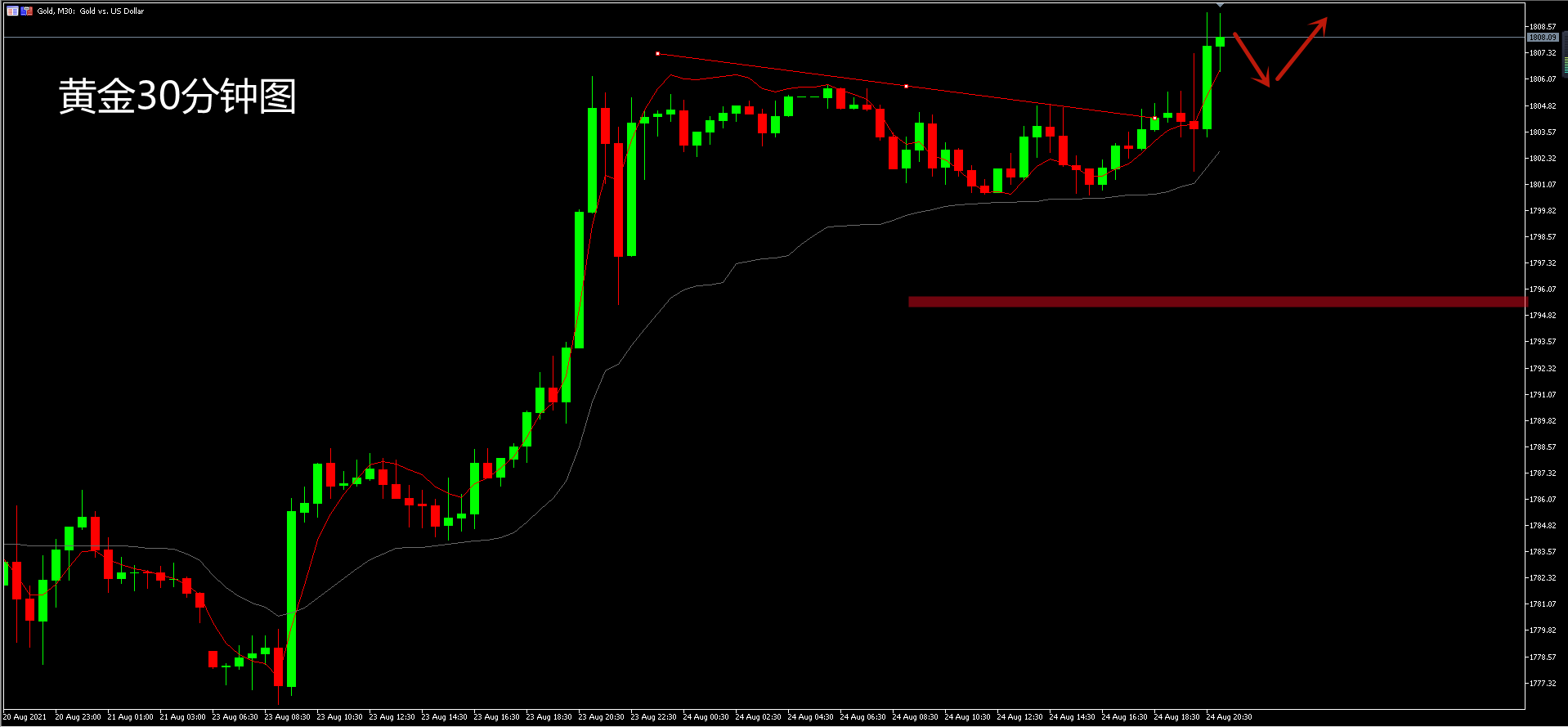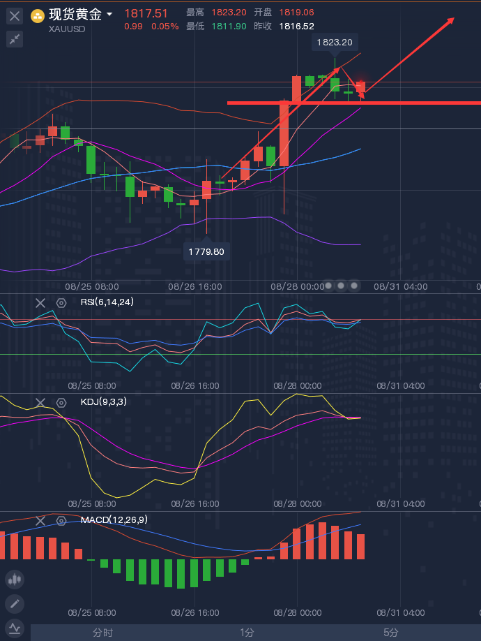 市场永远在多空相互博奕中进行,行情时儿强势上攻,时而急速下跌,你无法控制市场的走向,我们唯一能做的就是保住本金,当行情不明朗时可以将手头的头寸出局观望,没必要因为不明行消耗自己的精力,行情是上还是下?最重要的要担心的是你将采取怎样的对策回应市场的变化,当你正确时,你能获得了多大的利润,当你错误的时候,你能够即时的规避,希望方锦鑫的文章能给你带来小小的收获。 黄金行情解析: 现货黄金周二(8月24日)亚市盘初开盘小幅下挫失守1800关口,跌至日内低位1799.5美元/盎司后展开上涨;直至美盘,黄金扩大涨幅,刷新日内高位1809.78美元/盎司,但仅触及日内高位后立即回落,截止收盘,收于1802