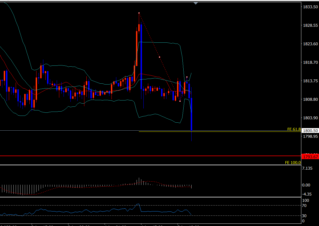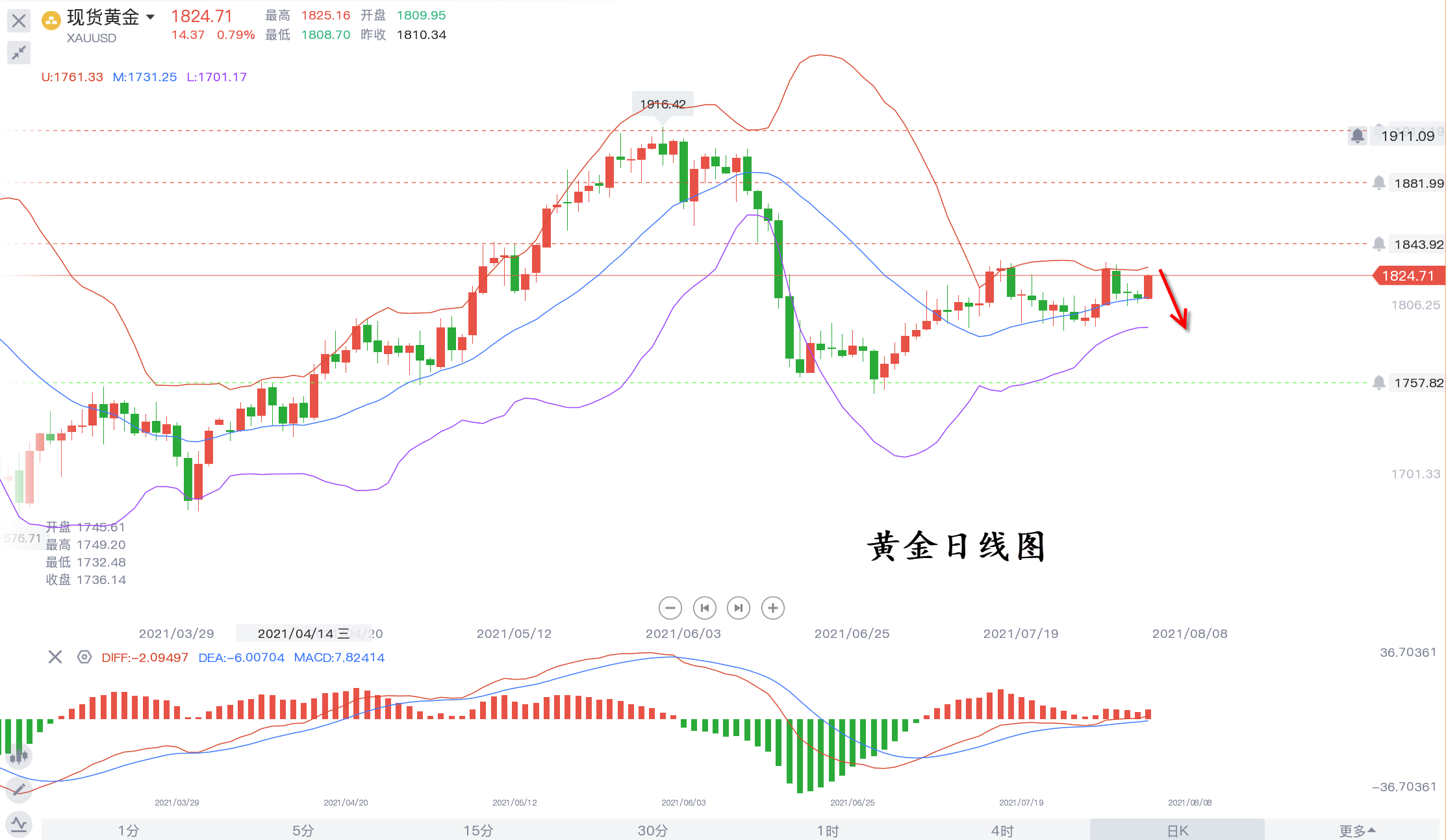 市场永远在多空相互博奕中进行,行情时儿强势上攻,时而急速下跌,你无法控制市场的走向,我们唯一能做的就是保住本金,当行情不明朗时可以将手头的头寸出局观望,没必要因为不明行消耗自己的精力,行情是上还是下?最重要的要担心的是你将采取怎样的对策回应市场的变化,当你正确时,你能获得了多大的利润,当你错误的时候,你能够即时的规避,希望方锦鑫的文章能给你带来小小的收获。 【基本面分析】 周一(8月2日),国际金价走低,投资者关注本周稍晚即将公布的美国7月非农就业数据,以衡量劳动市场的健康状况。劳动力市场健康运行是美联储缩减货币刺激措施的重要先决条件。 北京时间16:34,现货黄金下跌0.33%至1808.